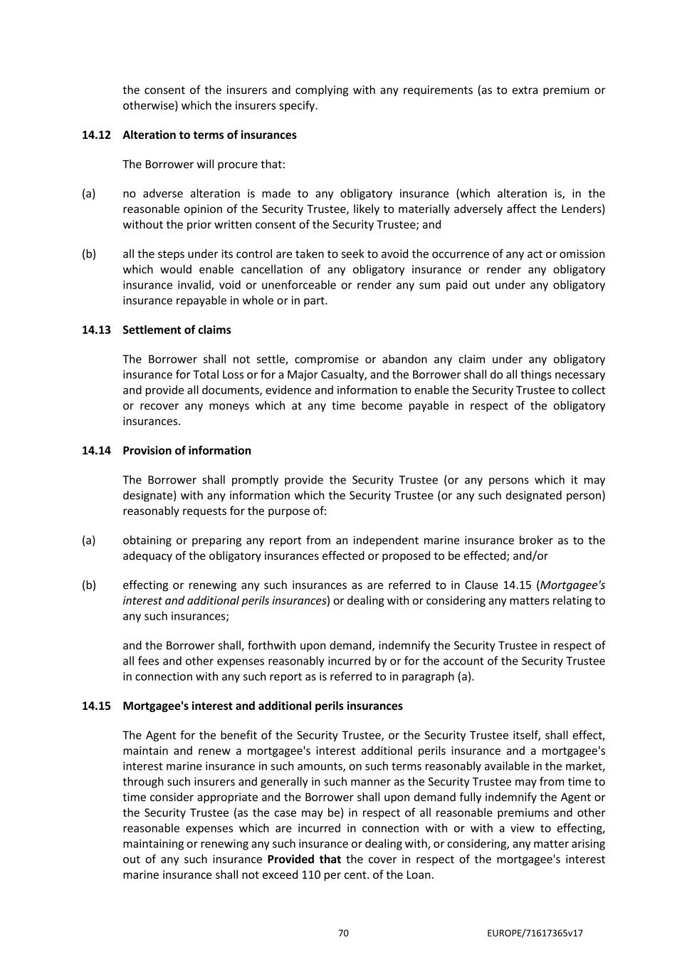 70 EUROPE/71617365v17 the consent of the insurers and complying with any requirements (as to extra premium or otherwise) which the insurers specify. 14.12 Alteration to terms of insurances The Borrower will procure that: (a) no adverse alteration is made to any obligatory insurance (which alteration is, in the reasonable opinion of the Security Trustee, likely to materially adversely affect the Lenders) without the prior written consent of the Security Trustee; and (b) all the steps under its control are taken to seek to avoid the occurrence of any act or omission which would enable cancellation of any obligatory insurance or render any obligatory insurance invalid, void or unenforceable or render any sum paid out under any obligatory insurance repayable in whole or in part. 14.13 Settlement of claims The Borrower shall not settle, compromise or abandon any claim under any obligatory insurance for Total Loss or for a Major Casualty, and the Borrower shall do all things necessary and provide all documents, evidence and information to enable the Security Trustee to collect or recover any moneys which at any time become payable in respect of the obligatory insurances. 14.14 Provision of information The Borrower shall promptly provide the Security Trustee (or any persons which it may designate) with any information which the Security Trustee (or any such designated person) reasonably requests for the purpose of: (a) obtaining or preparing any report from an independent marine insurance broker as to the adequacy of the obligatory insurances effected or proposed to be effected; and/or (b) effecting or renewing any such insurances as are referred to in Clause 14.15 (Mortgagee's interest and additional perils insurances) or dealing with or considering any matters relating to any such insurances; and the Borrower shall, forthwith upon demand, indemnify the Security Trustee in respect of all fees and other expenses reasonably incurred by or for the account of the Security Trustee in connection with any such report as is referred to in paragraph (a). 14.15 Mortgagee's interest and additional perils insurances The Agent for the benefit of the Security Trustee, or the Security Trustee itself, shall effect, maintain and renew a mortgagee's interest additional perils insurance and a mortgagee's interest marine insurance in such amounts, on such terms reasonably available in the market, through such insurers and generally in such manner as the Security Trustee may from time to time consider appropriate and the Borrower shall upon demand fully indemnify the Agent or the Security Trustee (as the case may be) in respect of all reasonable premiums and other reasonable expenses which are incurred in connection with or with a view to effecting, maintaining or renewing any such insurance or dealing with, or considering, any matter arising out of any such insurance Provided that the cover in respect of the mortgagee's interest marine insurance shall not exceed 110 per cent. of the Loan.