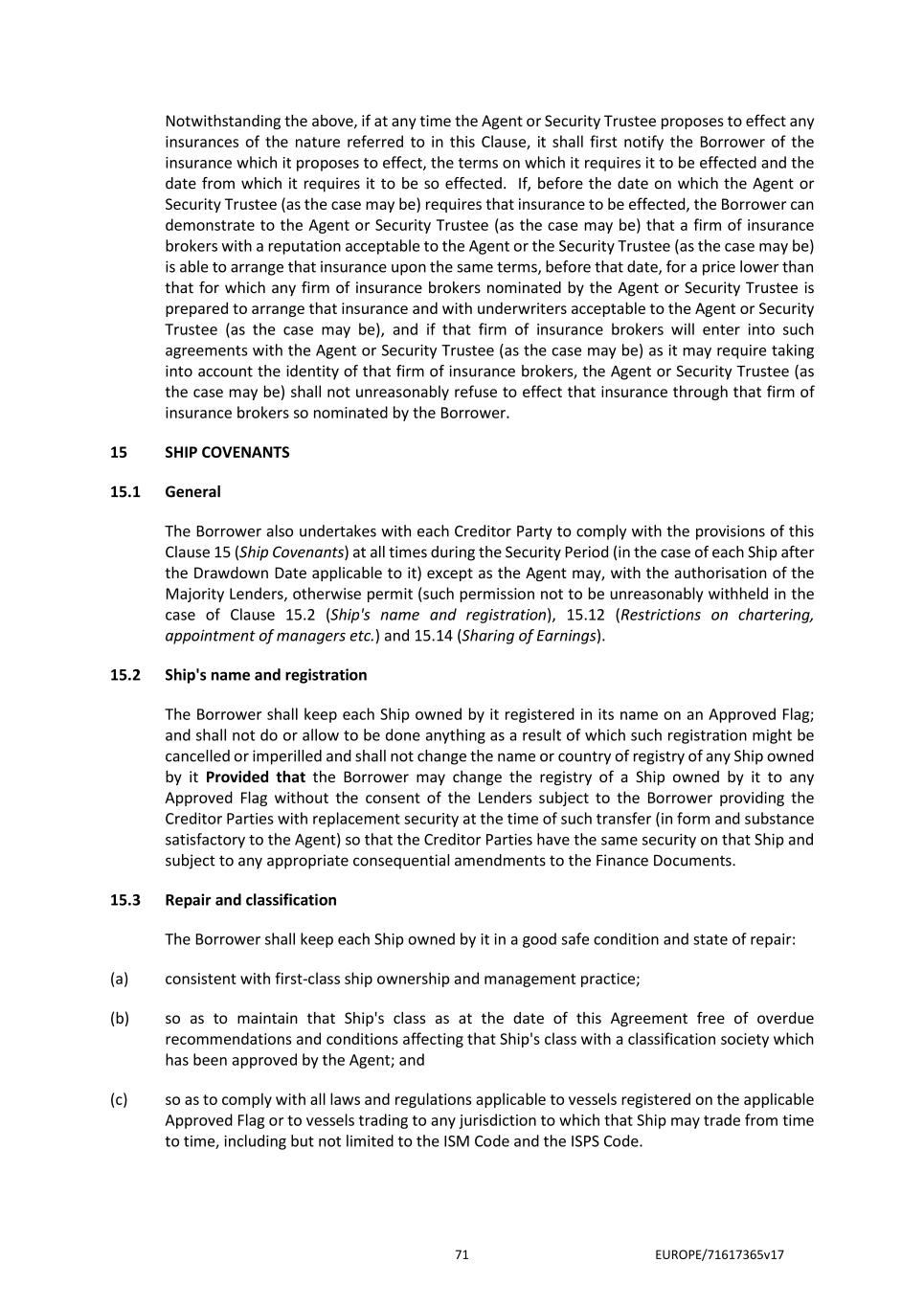 71 EUROPE/71617365v17 Notwithstanding the above, if at any time the Agent or Security Trustee proposes to effect any insurances of the nature referred to in this Clause, it shall first notify the Borrower of the insurance which it proposes to effect, the terms on which it requires it to be effected and the date from which it requires it to be so effected. If, before the date on which the Agent or Security Trustee (as the case may be) requires that insurance to be effected, the Borrower can demonstrate to the Agent or Security Trustee (as the case may be) that a firm of insurance brokers with a reputation acceptable to the Agent or the Security Trustee (as the case may be) is able to arrange that insurance upon the same terms, before that date, for a price lower than that for which any firm of insurance brokers nominated by the Agent or Security Trustee is prepared to arrange that insurance and with underwriters acceptable to the Agent or Security Trustee (as the case may be), and if that firm of insurance brokers will enter into such agreements with the Agent or Security Trustee (as the case may be) as it may require taking into account the identity of that firm of insurance brokers, the Agent or Security Trustee (as the case may be) shall not unreasonably refuse to effect that insurance through that firm of insurance brokers so nominated by the Borrower. 15 SHIP COVENANTS 15.1 General The Borrower also undertakes with each Creditor Party to comply with the provisions of this Clause 15 (Ship Covenants) at all times during the Security Period (in the case of each Ship after the Drawdown Date applicable to it) except as the Agent may, with the authorisation of the Majority Lenders, otherwise permit (such permission not to be unreasonably withheld in the case of Clause 15.2 (Ship's name and registration), 15.12 (Restrictions on chartering, appointment of managers etc.) and 15.14 (Sharing of Earnings). 15.2 Ship's name and registration The Borrower shall keep each Ship owned by it registered in its name on an Approved Flag; and shall not do or allow to be done anything as a result of which such registration might be cancelled or imperilled and shall not change the name or country of registry of any Ship owned by it Provided that the Borrower may change the registry of a Ship owned by it to any Approved Flag without the consent of the Lenders subject to the Borrower providing the Creditor Parties with replacement security at the time of such transfer (in form and substance satisfactory to the Agent) so that the Creditor Parties have the same security on that Ship and subject to any appropriate consequential amendments to the Finance Documents. 15.3 Repair and classification The Borrower shall keep each Ship owned by it in a good safe condition and state of repair: (a) consistent with first-class ship ownership and management practice; (b) so as to maintain that Ship's class as at the date of this Agreement free of overdue recommendations and conditions affecting that Ship's class with a classification society which has been approved by the Agent; and (c) so as to comply with all laws and regulations applicable to vessels registered on the applicable Approved Flag or to vessels trading to any jurisdiction to which that Ship may trade from time to time, including but not limited to the ISM Code and the ISPS Code.