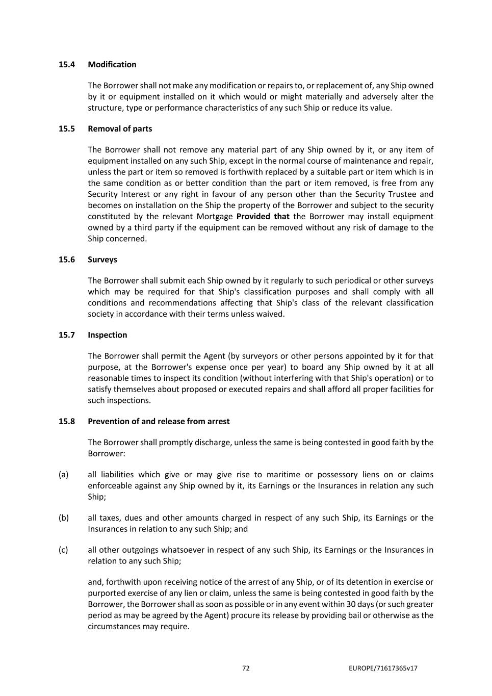 72 EUROPE/71617365v17 15.4 Modification The Borrower shall not make any modification or repairs to, or replacement of, any Ship owned by it or equipment installed on it which would or might materially and adversely alter the structure, type or performance characteristics of any such Ship or reduce its value. 15.5 Removal of parts The Borrower shall not remove any material part of any Ship owned by it, or any item of equipment installed on any such Ship, except in the normal course of maintenance and repair, unless the part or item so removed is forthwith replaced by a suitable part or item which is in the same condition as or better condition than the part or item removed, is free from any Security Interest or any right in favour of any person other than the Security Trustee and becomes on installation on the Ship the property of the Borrower and subject to the security constituted by the relevant Mortgage Provided that the Borrower may install equipment owned by a third party if the equipment can be removed without any risk of damage to the Ship concerned. 15.6 Surveys The Borrower shall submit each Ship owned by it regularly to such periodical or other surveys which may be required for that Ship's classification purposes and shall comply with all conditions and recommendations affecting that Ship's class of the relevant classification society in accordance with their terms unless waived. 15.7 Inspection The Borrower shall permit the Agent (by surveyors or other persons appointed by it for that purpose, at the Borrower's expense once per year) to board any Ship owned by it at all reasonable times to inspect its condition (without interfering with that Ship's operation) or to satisfy themselves about proposed or executed repairs and shall afford all proper facilities for such inspections. 15.8 Prevention of and release from arrest The Borrower shall promptly discharge, unless the same is being contested in good faith by the Borrower: (a) all liabilities which give or may give rise to maritime or possessory liens on or claims enforceable against any Ship owned by it, its Earnings or the Insurances in relation any such Ship; (b) all taxes, dues and other amounts charged in respect of any such Ship, its Earnings or the Insurances in relation to any such Ship; and (c) all other outgoings whatsoever in respect of any such Ship, its Earnings or the Insurances in relation to any such Ship; and, forthwith upon receiving notice of the arrest of any Ship, or of its detention in exercise or purported exercise of any lien or claim, unless the same is being contested in good faith by the Borrower, the Borrower shall as soon as possible or in any event within 30 days (or such greater period as may be agreed by the Agent) procure its release by providing bail or otherwise as the circumstances may require.