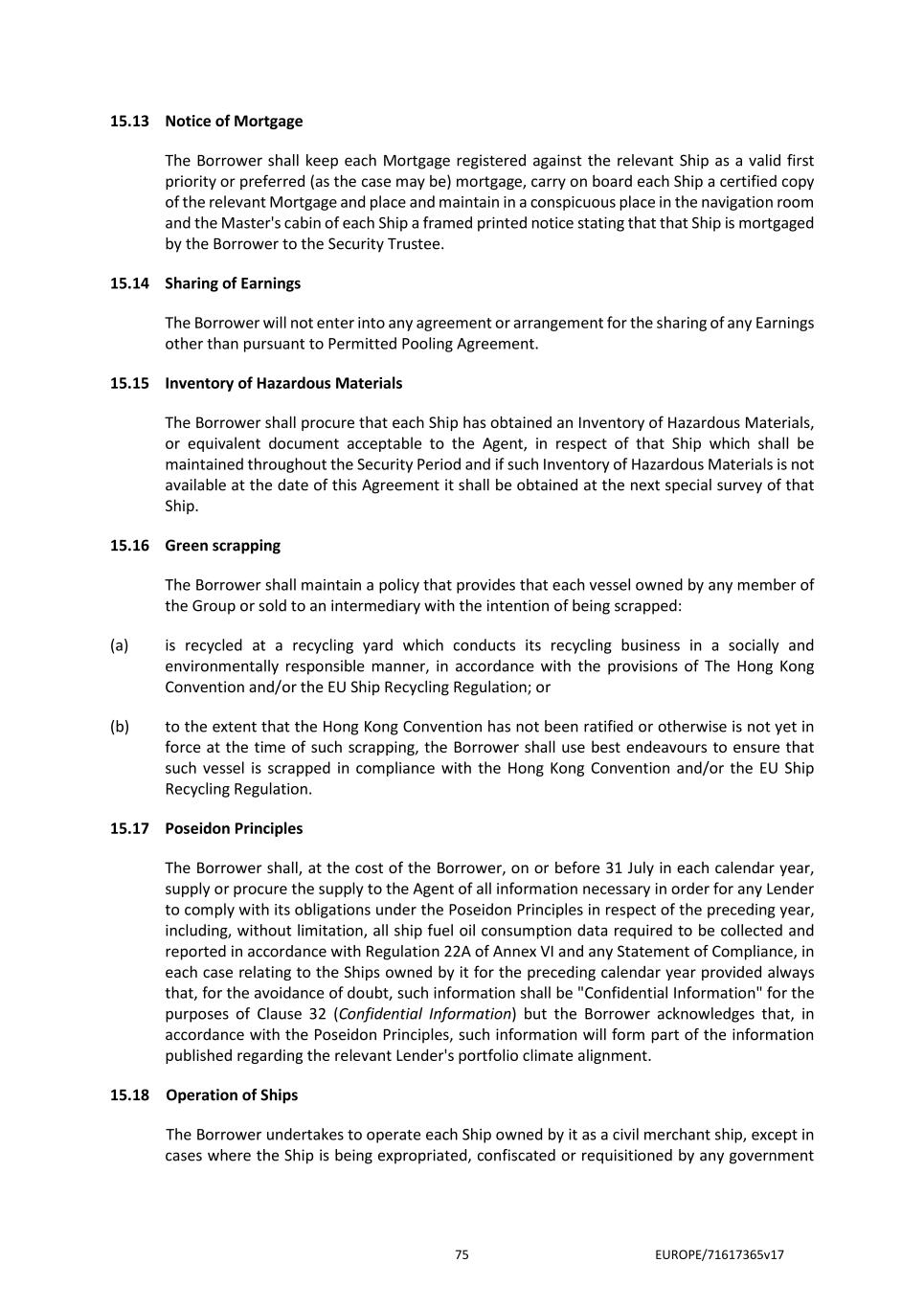 75 EUROPE/71617365v17 15.13 Notice of Mortgage The Borrower shall keep each Mortgage registered against the relevant Ship as a valid first priority or preferred (as the case may be) mortgage, carry on board each Ship a certified copy of the relevant Mortgage and place and maintain in a conspicuous place in the navigation room and the Master's cabin of each Ship a framed printed notice stating that that Ship is mortgaged by the Borrower to the Security Trustee. 15.14 Sharing of Earnings The Borrower will not enter into any agreement or arrangement for the sharing of any Earnings other than pursuant to Permitted Pooling Agreement. 15.15 Inventory of Hazardous Materials The Borrower shall procure that each Ship has obtained an Inventory of Hazardous Materials, or equivalent document acceptable to the Agent, in respect of that Ship which shall be maintained throughout the Security Period and if such Inventory of Hazardous Materials is not available at the date of this Agreement it shall be obtained at the next special survey of that Ship. 15.16 Green scrapping The Borrower shall maintain a policy that provides that each vessel owned by any member of the Group or sold to an intermediary with the intention of being scrapped: (a) is recycled at a recycling yard which conducts its recycling business in a socially and environmentally responsible manner, in accordance with the provisions of The Hong Kong Convention and/or the EU Ship Recycling Regulation; or (b) to the extent that the Hong Kong Convention has not been ratified or otherwise is not yet in force at the time of such scrapping, the Borrower shall use best endeavours to ensure that such vessel is scrapped in compliance with the Hong Kong Convention and/or the EU Ship Recycling Regulation. 15.17 Poseidon Principles The Borrower shall, at the cost of the Borrower, on or before 31 July in each calendar year, supply or procure the supply to the Agent of all information necessary in order for any Lender to comply with its obligations under the Poseidon Principles in respect of the preceding year, including, without limitation, all ship fuel oil consumption data required to be collected and reported in accordance with Regulation 22A of Annex VI and any Statement of Compliance, in each case relating to the Ships owned by it for the preceding calendar year provided always that, for the avoidance of doubt, such information shall be "Confidential Information" for the purposes of Clause 32 (Confidential Information) but the Borrower acknowledges that, in accordance with the Poseidon Principles, such information will form part of the information published regarding the relevant Lender's portfolio climate alignment. 15.18 Operation of Ships The Borrower undertakes to operate each Ship owned by it as a civil merchant ship, except in cases where the Ship is being expropriated, confiscated or requisitioned by any government