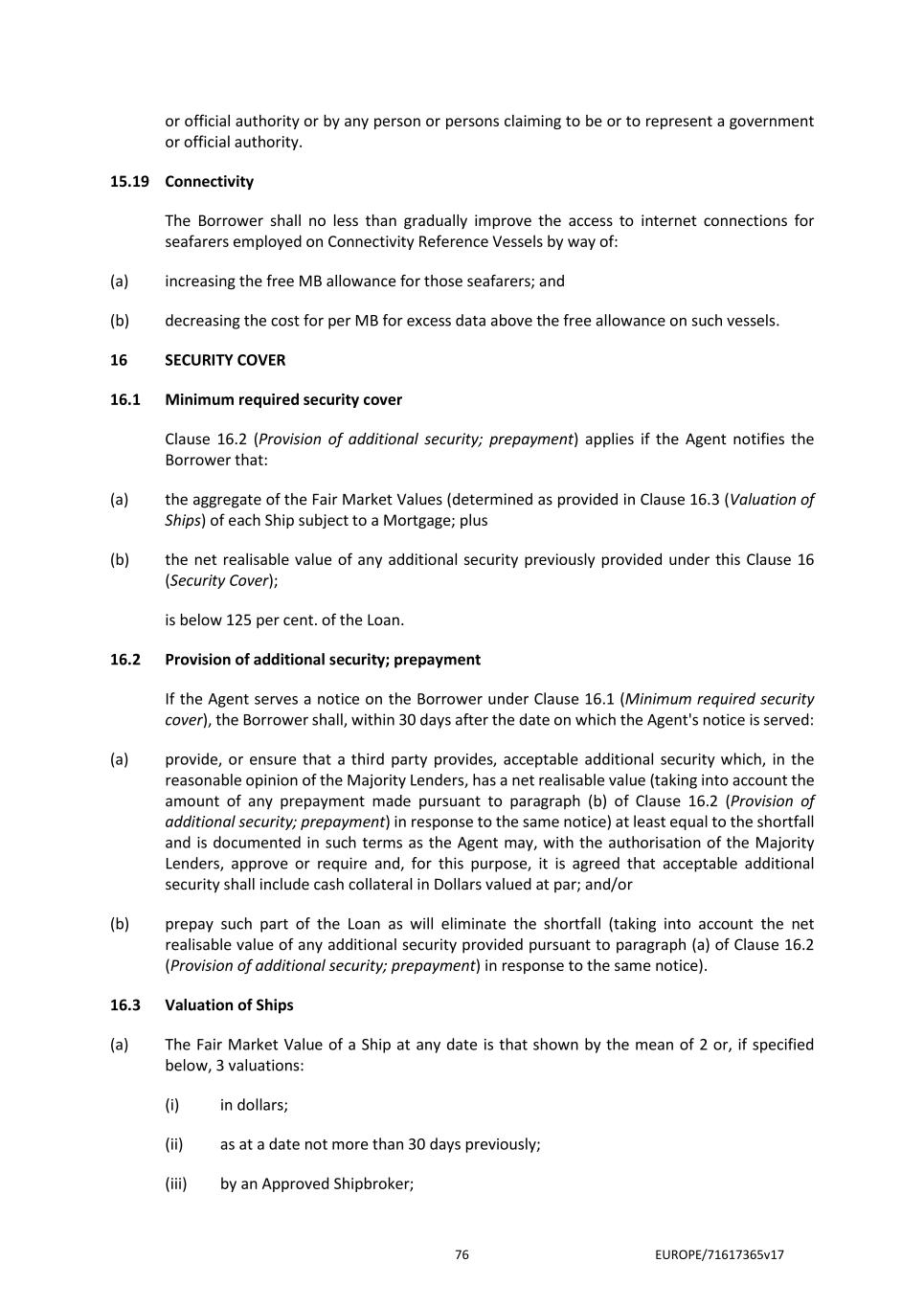 76 EUROPE/71617365v17 or official authority or by any person or persons claiming to be or to represent a government or official authority. 15.19 Connectivity The Borrower shall no less than gradually improve the access to internet connections for seafarers employed on Connectivity Reference Vessels by way of: (a) increasing the free MB allowance for those seafarers; and (b) decreasing the cost for per MB for excess data above the free allowance on such vessels. 16 SECURITY COVER 16.1 Minimum required security cover Clause 16.2 (Provision of additional security; prepayment) applies if the Agent notifies the Borrower that: (a) the aggregate of the Fair Market Values (determined as provided in Clause 16.3 (Valuation of Ships) of each Ship subject to a Mortgage; plus (b) the net realisable value of any additional security previously provided under this Clause 16 (Security Cover); is below 125 per cent. of the Loan. 16.2 Provision of additional security; prepayment If the Agent serves a notice on the Borrower under Clause 16.1 (Minimum required security cover), the Borrower shall, within 30 days after the date on which the Agent's notice is served: (a) provide, or ensure that a third party provides, acceptable additional security which, in the reasonable opinion of the Majority Lenders, has a net realisable value (taking into account the amount of any prepayment made pursuant to paragraph (b) of Clause 16.2 (Provision of additional security; prepayment) in response to the same notice) at least equal to the shortfall and is documented in such terms as the Agent may, with the authorisation of the Majority Lenders, approve or require and, for this purpose, it is agreed that acceptable additional security shall include cash collateral in Dollars valued at par; and/or (b) prepay such part of the Loan as will eliminate the shortfall (taking into account the net realisable value of any additional security provided pursuant to paragraph (a) of Clause 16.2 (Provision of additional security; prepayment) in response to the same notice). 16.3 Valuation of Ships (a) The Fair Market Value of a Ship at any date is that shown by the mean of 2 or, if specified below, 3 valuations: (i) in dollars; (ii) as at a date not more than 30 days previously; (iii) by an Approved Shipbroker;