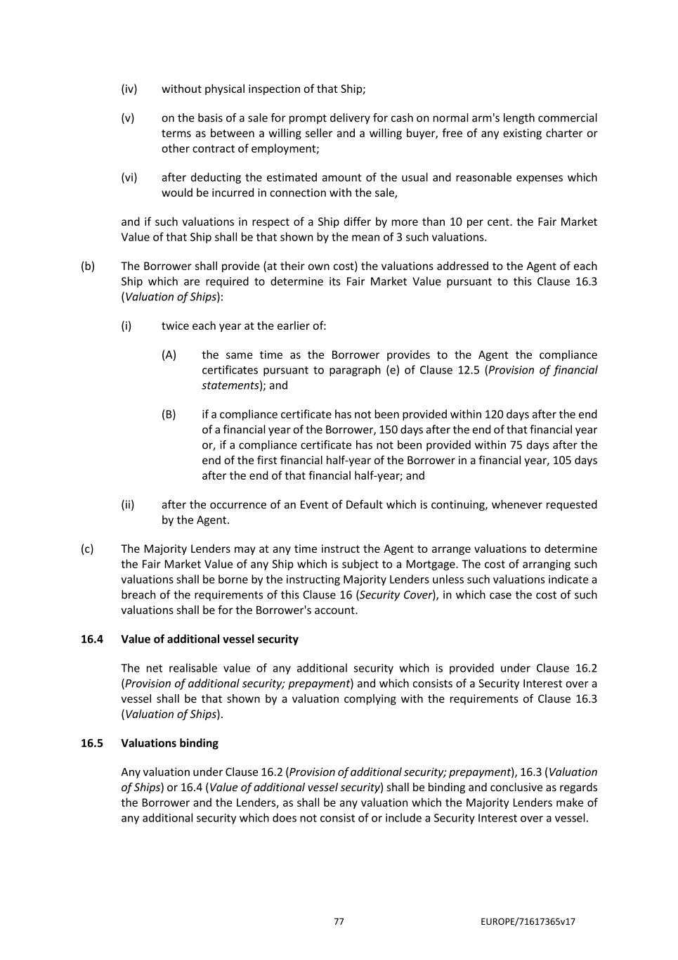 77 EUROPE/71617365v17 (iv) without physical inspection of that Ship; (v) on the basis of a sale for prompt delivery for cash on normal arm's length commercial terms as between a willing seller and a willing buyer, free of any existing charter or other contract of employment; (vi) after deducting the estimated amount of the usual and reasonable expenses which would be incurred in connection with the sale, and if such valuations in respect of a Ship differ by more than 10 per cent. the Fair Market Value of that Ship shall be that shown by the mean of 3 such valuations. (b) The Borrower shall provide (at their own cost) the valuations addressed to the Agent of each Ship which are required to determine its Fair Market Value pursuant to this Clause 16.3 (Valuation of Ships): (i) twice each year at the earlier of: (A) the same time as the Borrower provides to the Agent the compliance certificates pursuant to paragraph (e) of Clause 12.5 (Provision of financial statements); and (B) if a compliance certificate has not been provided within 120 days after the end of a financial year of the Borrower, 150 days after the end of that financial year or, if a compliance certificate has not been provided within 75 days after the end of the first financial half-year of the Borrower in a financial year, 105 days after the end of that financial half-year; and (ii) after the occurrence of an Event of Default which is continuing, whenever requested by the Agent. (c) The Majority Lenders may at any time instruct the Agent to arrange valuations to determine the Fair Market Value of any Ship which is subject to a Mortgage. The cost of arranging such valuations shall be borne by the instructing Majority Lenders unless such valuations indicate a breach of the requirements of this Clause 16 (Security Cover), in which case the cost of such valuations shall be for the Borrower's account. 16.4 Value of additional vessel security The net realisable value of any additional security which is provided under Clause 16.2 (Provision of additional security; prepayment) and which consists of a Security Interest over a vessel shall be that shown by a valuation complying with the requirements of Clause 16.3 (Valuation of Ships). 16.5 Valuations binding Any valuation under Clause 16.2 (Provision of additional security; prepayment), 16.3 (Valuation of Ships) or 16.4 (Value of additional vessel security) shall be binding and conclusive as regards the Borrower and the Lenders, as shall be any valuation which the Majority Lenders make of any additional security which does not consist of or include a Security Interest over a vessel.
