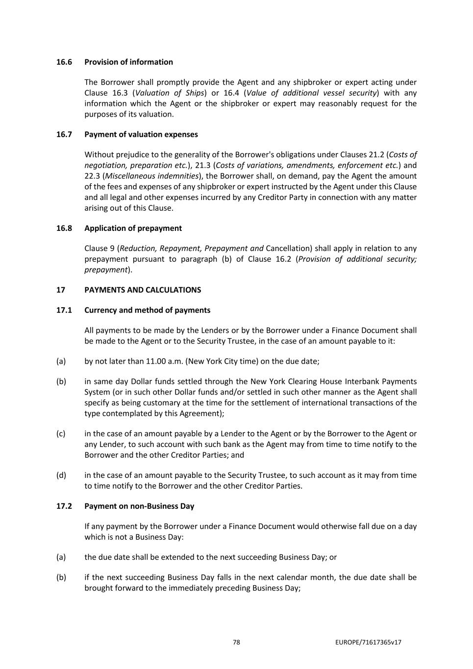 78 EUROPE/71617365v17 16.6 Provision of information The Borrower shall promptly provide the Agent and any shipbroker or expert acting under Clause 16.3 (Valuation of Ships) or 16.4 (Value of additional vessel security) with any information which the Agent or the shipbroker or expert may reasonably request for the purposes of its valuation. 16.7 Payment of valuation expenses Without prejudice to the generality of the Borrower's obligations under Clauses 21.2 (Costs of negotiation, preparation etc.), 21.3 (Costs of variations, amendments, enforcement etc.) and 22.3 (Miscellaneous indemnities), the Borrower shall, on demand, pay the Agent the amount of the fees and expenses of any shipbroker or expert instructed by the Agent under this Clause and all legal and other expenses incurred by any Creditor Party in connection with any matter arising out of this Clause. 16.8 Application of prepayment Clause 9 (Reduction, Repayment, Prepayment and Cancellation) shall apply in relation to any prepayment pursuant to paragraph (b) of Clause 16.2 (Provision of additional security; prepayment). 17 PAYMENTS AND CALCULATIONS 17.1 Currency and method of payments All payments to be made by the Lenders or by the Borrower under a Finance Document shall be made to the Agent or to the Security Trustee, in the case of an amount payable to it: (a) by not later than 11.00 a.m. (New York City time) on the due date; (b) in same day Dollar funds settled through the New York Clearing House Interbank Payments System (or in such other Dollar funds and/or settled in such other manner as the Agent shall specify as being customary at the time for the settlement of international transactions of the type contemplated by this Agreement); (c) in the case of an amount payable by a Lender to the Agent or by the Borrower to the Agent or any Lender, to such account with such bank as the Agent may from time to time notify to the Borrower and the other Creditor Parties; and (d) in the case of an amount payable to the Security Trustee, to such account as it may from time to time notify to the Borrower and the other Creditor Parties. 17.2 Payment on non-Business Day If any payment by the Borrower under a Finance Document would otherwise fall due on a day which is not a Business Day: (a) the due date shall be extended to the next succeeding Business Day; or (b) if the next succeeding Business Day falls in the next calendar month, the due date shall be brought forward to the immediately preceding Business Day;