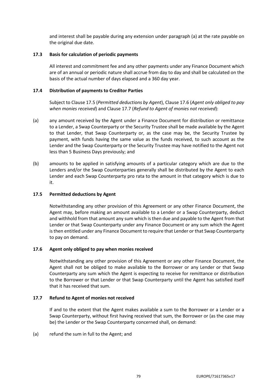 79 EUROPE/71617365v17 and interest shall be payable during any extension under paragraph (a) at the rate payable on the original due date. 17.3 Basis for calculation of periodic payments All interest and commitment fee and any other payments under any Finance Document which are of an annual or periodic nature shall accrue from day to day and shall be calculated on the basis of the actual number of days elapsed and a 360 day year. 17.4 Distribution of payments to Creditor Parties Subject to Clause 17.5 (Permitted deductions by Agent), Clause 17.6 (Agent only obliged to pay when monies received) and Clause 17.7 (Refund to Agent of monies not received): (a) any amount received by the Agent under a Finance Document for distribution or remittance to a Lender, a Swap Counterparty or the Security Trustee shall be made available by the Agent to that Lender, that Swap Counterparty or, as the case may be, the Security Trustee by payment, with funds having the same value as the funds received, to such account as the Lender and the Swap Counterparty or the Security Trustee may have notified to the Agent not less than 5 Business Days previously; and (b) amounts to be applied in satisfying amounts of a particular category which are due to the Lenders and/or the Swap Counterparties generally shall be distributed by the Agent to each Lender and each Swap Counterparty pro rata to the amount in that category which is due to it. 17.5 Permitted deductions by Agent Notwithstanding any other provision of this Agreement or any other Finance Document, the Agent may, before making an amount available to a Lender or a Swap Counterparty, deduct and withhold from that amount any sum which is then due and payable to the Agent from that Lender or that Swap Counterparty under any Finance Document or any sum which the Agent is then entitled under any Finance Document to require that Lender or that Swap Counterparty to pay on demand. 17.6 Agent only obliged to pay when monies received Notwithstanding any other provision of this Agreement or any other Finance Document, the Agent shall not be obliged to make available to the Borrower or any Lender or that Swap Counterparty any sum which the Agent is expecting to receive for remittance or distribution to the Borrower or that Lender or that Swap Counterparty until the Agent has satisfied itself that it has received that sum. 17.7 Refund to Agent of monies not received If and to the extent that the Agent makes available a sum to the Borrower or a Lender or a Swap Counterparty, without first having received that sum, the Borrower or (as the case may be) the Lender or the Swap Counterparty concerned shall, on demand: (a) refund the sum in full to the Agent; and