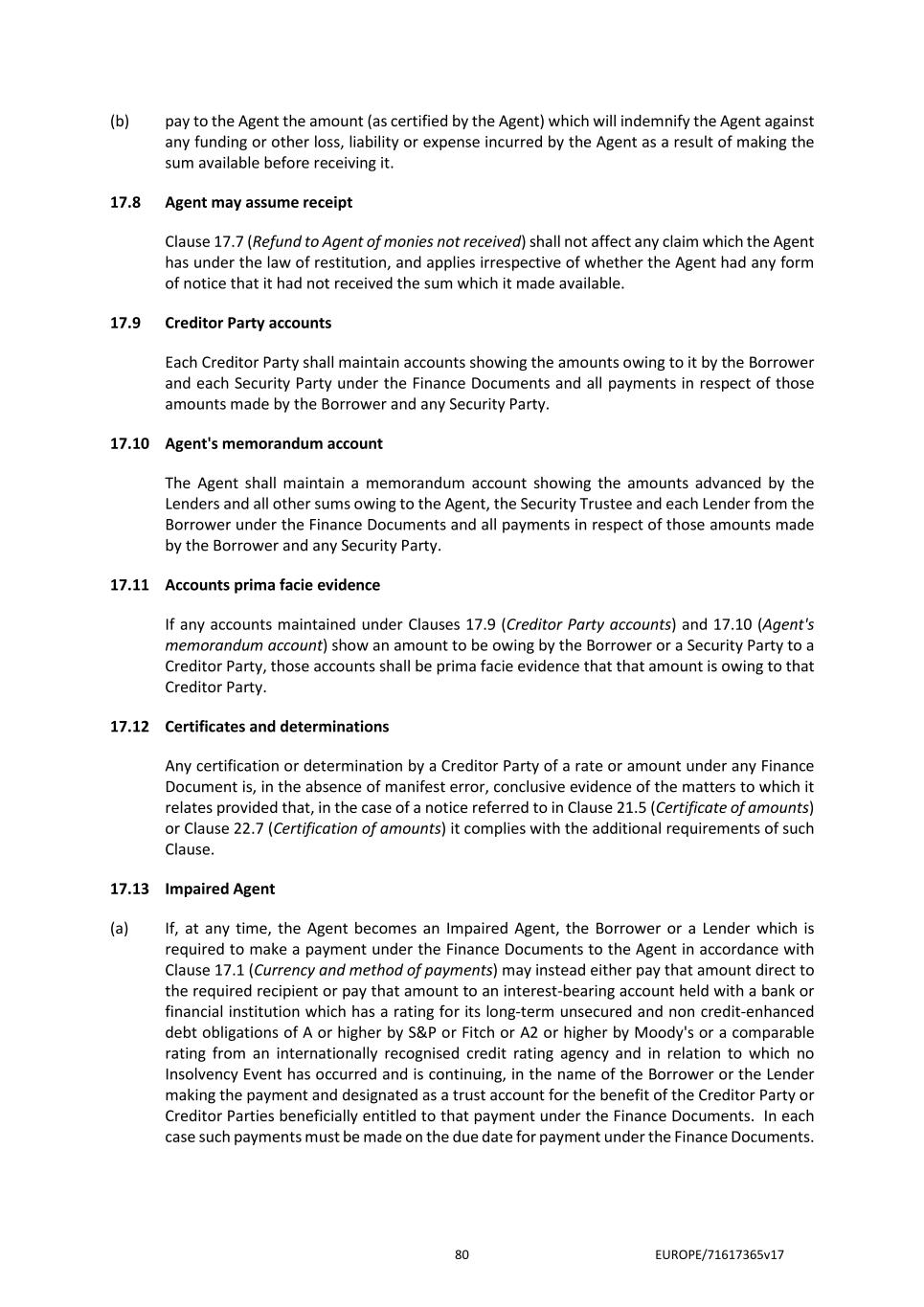 80 EUROPE/71617365v17 (b) pay to the Agent the amount (as certified by the Agent) which will indemnify the Agent against any funding or other loss, liability or expense incurred by the Agent as a result of making the sum available before receiving it. 17.8 Agent may assume receipt Clause 17.7 (Refund to Agent of monies not received) shall not affect any claim which the Agent has under the law of restitution, and applies irrespective of whether the Agent had any form of notice that it had not received the sum which it made available. 17.9 Creditor Party accounts Each Creditor Party shall maintain accounts showing the amounts owing to it by the Borrower and each Security Party under the Finance Documents and all payments in respect of those amounts made by the Borrower and any Security Party. 17.10 Agent's memorandum account The Agent shall maintain a memorandum account showing the amounts advanced by the Lenders and all other sums owing to the Agent, the Security Trustee and each Lender from the Borrower under the Finance Documents and all payments in respect of those amounts made by the Borrower and any Security Party. 17.11 Accounts prima facie evidence If any accounts maintained under Clauses 17.9 (Creditor Party accounts) and 17.10 (Agent's memorandum account) show an amount to be owing by the Borrower or a Security Party to a Creditor Party, those accounts shall be prima facie evidence that that amount is owing to that Creditor Party. 17.12 Certificates and determinations Any certification or determination by a Creditor Party of a rate or amount under any Finance Document is, in the absence of manifest error, conclusive evidence of the matters to which it relates provided that, in the case of a notice referred to in Clause 21.5 (Certificate of amounts) or Clause 22.7 (Certification of amounts) it complies with the additional requirements of such Clause. 17.13 Impaired Agent (a) If, at any time, the Agent becomes an Impaired Agent, the Borrower or a Lender which is required to make a payment under the Finance Documents to the Agent in accordance with Clause 17.1 (Currency and method of payments) may instead either pay that amount direct to the required recipient or pay that amount to an interest-bearing account held with a bank or financial institution which has a rating for its long-term unsecured and non credit-enhanced debt obligations of A or higher by S&P or Fitch or A2 or higher by Moody's or a comparable rating from an internationally recognised credit rating agency and in relation to which no Insolvency Event has occurred and is continuing, in the name of the Borrower or the Lender making the payment and designated as a trust account for the benefit of the Creditor Party or Creditor Parties beneficially entitled to that payment under the Finance Documents. In each case such payments must be made on the due date for payment under the Finance Documents.