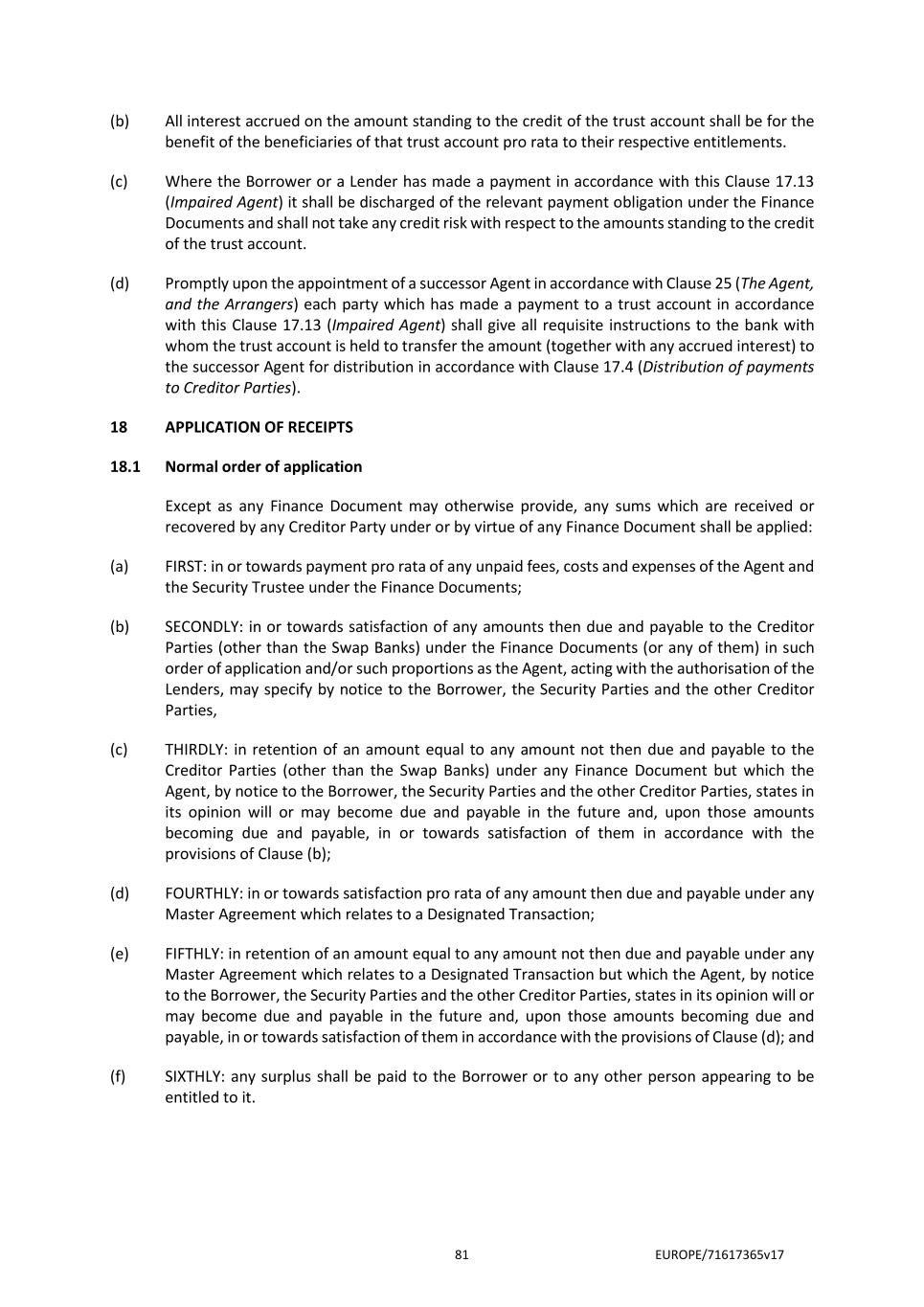 81 EUROPE/71617365v17 (b) All interest accrued on the amount standing to the credit of the trust account shall be for the benefit of the beneficiaries of that trust account pro rata to their respective entitlements. (c) Where the Borrower or a Lender has made a payment in accordance with this Clause 17.13 (Impaired Agent) it shall be discharged of the relevant payment obligation under the Finance Documents and shall not take any credit risk with respect to the amounts standing to the credit of the trust account. (d) Promptly upon the appointment of a successor Agent in accordance with Clause 25 (The Agent, and the Arrangers) each party which has made a payment to a trust account in accordance with this Clause 17.13 (Impaired Agent) shall give all requisite instructions to the bank with whom the trust account is held to transfer the amount (together with any accrued interest) to the successor Agent for distribution in accordance with Clause 17.4 (Distribution of payments to Creditor Parties). 18 APPLICATION OF RECEIPTS 18.1 Normal order of application Except as any Finance Document may otherwise provide, any sums which are received or recovered by any Creditor Party under or by virtue of any Finance Document shall be applied: (a) FIRST: in or towards payment pro rata of any unpaid fees, costs and expenses of the Agent and the Security Trustee under the Finance Documents; (b) SECONDLY: in or towards satisfaction of any amounts then due and payable to the Creditor Parties (other than the Swap Banks) under the Finance Documents (or any of them) in such order of application and/or such proportions as the Agent, acting with the authorisation of the Lenders, may specify by notice to the Borrower, the Security Parties and the other Creditor Parties, (c) THIRDLY: in retention of an amount equal to any amount not then due and payable to the Creditor Parties (other than the Swap Banks) under any Finance Document but which the Agent, by notice to the Borrower, the Security Parties and the other Creditor Parties, states in its opinion will or may become due and payable in the future and, upon those amounts becoming due and payable, in or towards satisfaction of them in accordance with the provisions of Clause (b); (d) FOURTHLY: in or towards satisfaction pro rata of any amount then due and payable under any Master Agreement which relates to a Designated Transaction; (e) FIFTHLY: in retention of an amount equal to any amount not then due and payable under any Master Agreement which relates to a Designated Transaction but which the Agent, by notice to the Borrower, the Security Parties and the other Creditor Parties, states in its opinion will or may become due and payable in the future and, upon those amounts becoming due and payable, in or towards satisfaction of them in accordance with the provisions of Clause (d); and (f) SIXTHLY: any surplus shall be paid to the Borrower or to any other person appearing to be entitled to it.