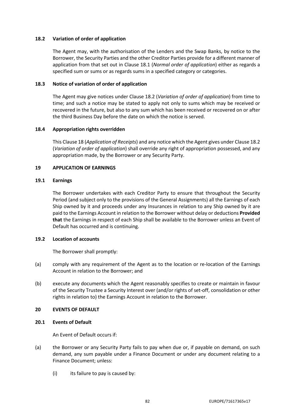 82 EUROPE/71617365v17 18.2 Variation of order of application The Agent may, with the authorisation of the Lenders and the Swap Banks, by notice to the Borrower, the Security Parties and the other Creditor Parties provide for a different manner of application from that set out in Clause 18.1 (Normal order of application) either as regards a specified sum or sums or as regards sums in a specified category or categories. 18.3 Notice of variation of order of application The Agent may give notices under Clause 18.2 (Variation of order of application) from time to time; and such a notice may be stated to apply not only to sums which may be received or recovered in the future, but also to any sum which has been received or recovered on or after the third Business Day before the date on which the notice is served. 18.4 Appropriation rights overridden This Clause 18 (Application of Receipts) and any notice which the Agent gives under Clause 18.2 (Variation of order of application) shall override any right of appropriation possessed, and any appropriation made, by the Borrower or any Security Party. 19 APPLICATION OF EARNINGS 19.1 Earnings The Borrower undertakes with each Creditor Party to ensure that throughout the Security Period (and subject only to the provisions of the General Assignments) all the Earnings of each Ship owned by it and proceeds under any Insurances in relation to any Ship owned by it are paid to the Earnings Account in relation to the Borrower without delay or deductions Provided that the Earnings in respect of each Ship shall be available to the Borrower unless an Event of Default has occurred and is continuing. 19.2 Location of accounts The Borrower shall promptly: (a) comply with any requirement of the Agent as to the location or re-location of the Earnings Account in relation to the Borrower; and (b) execute any documents which the Agent reasonably specifies to create or maintain in favour of the Security Trustee a Security Interest over (and/or rights of set-off, consolidation or other rights in relation to) the Earnings Account in relation to the Borrower. 20 EVENTS OF DEFAULT 20.1 Events of Default An Event of Default occurs if: (a) the Borrower or any Security Party fails to pay when due or, if payable on demand, on such demand, any sum payable under a Finance Document or under any document relating to a Finance Document; unless: (i) its failure to pay is caused by: