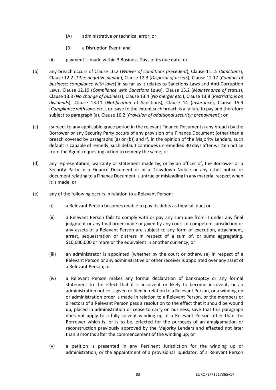 83 EUROPE/71617365v17 (A) administrative or technical error; or (B) a Disruption Event; and (ii) payment is made within 3 Business Days of its due date; or (b) any breach occurs of Clause 10.2 (Waiver of conditions precedent), Clause 11.15 (Sanctions), Clause 12.2 (Title; negative pledge), Clause 12.3 (Disposal of assets), Clause 12.17 (Conduct of business; compliance with laws) in so far as it relates to Sanctions Laws and Anti-Corruption Laws, Clause 12.19 (Compliance with Sanctions Laws), Clause 13.2 (Maintenance of status), Clause 13.3 (No change of business), Clause 13.4 (No merger etc.), Clause 13.8 (Restrictions on dividends), Clause 13.11 (Notification of Sanctions), Clause 14 (Insurance), Clause 15.9 (Compliance with laws etc.), or, save to the extent such breach is a failure to pay and therefore subject to paragraph (a), Clause 16.2 (Provision of additional security; prepayment); or (c) (subject to any applicable grace period in the relevant Finance Documents) any breach by the Borrower or any Security Party occurs of any provision of a Finance Document (other than a breach covered by paragraphs (a) or (b)) and if, in the opinion of the Majority Lenders, such default is capable of remedy, such default continues unremedied 30 days after written notice from the Agent requesting action to remedy the same; or (d) any representation, warranty or statement made by, or by an officer of, the Borrower or a Security Party in a Finance Document or in a Drawdown Notice or any other notice or document relating to a Finance Document is untrue or misleading in any material respect when it is made; or (e) any of the following occurs in relation to a Relevant Person: (i) a Relevant Person becomes unable to pay its debts as they fall due; or (ii) a Relevant Person fails to comply with or pay any sum due from it under any final judgment or any final order made or given by any court of competent jurisdiction or any assets of a Relevant Person are subject to any form of execution, attachment, arrest, sequestration or distress in respect of a sum of, or sums aggregating, $10,000,000 or more or the equivalent in another currency; or (iii) an administrator is appointed (whether by the court or otherwise) in respect of a Relevant Person or any administrative or other receiver is appointed over any asset of a Relevant Person; or (iv) a Relevant Person makes any formal declaration of bankruptcy or any formal statement to the effect that it is insolvent or likely to become insolvent, or an administration notice is given or filed in relation to a Relevant Person, or a winding up or administration order is made in relation to a Relevant Person, or the members or directors of a Relevant Person pass a resolution to the effect that it should be wound up, placed in administration or cease to carry on business, save that this paragraph does not apply to a fully solvent winding up of a Relevant Person other than the Borrower which is, or is to be, effected for the purposes of an amalgamation or reconstruction previously approved by the Majority Lenders and effected not later than 3 months after the commencement of the winding up; or (v) a petition is presented in any Pertinent Jurisdiction for the winding up or administration, or the appointment of a provisional liquidator, of a Relevant Person