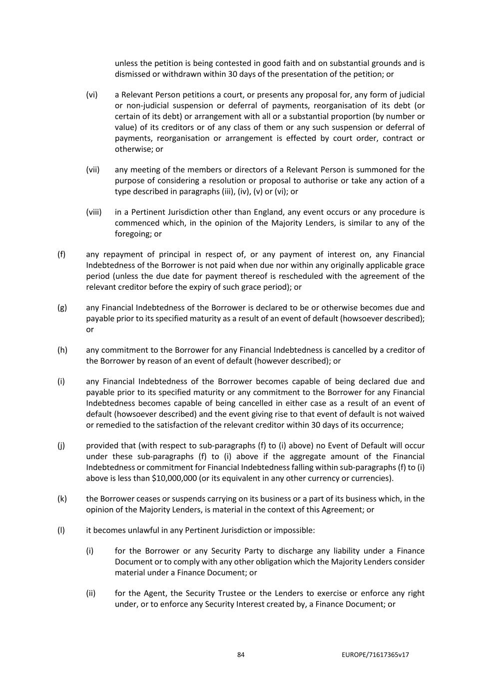 84 EUROPE/71617365v17 unless the petition is being contested in good faith and on substantial grounds and is dismissed or withdrawn within 30 days of the presentation of the petition; or (vi) a Relevant Person petitions a court, or presents any proposal for, any form of judicial or non-judicial suspension or deferral of payments, reorganisation of its debt (or certain of its debt) or arrangement with all or a substantial proportion (by number or value) of its creditors or of any class of them or any such suspension or deferral of payments, reorganisation or arrangement is effected by court order, contract or otherwise; or (vii) any meeting of the members or directors of a Relevant Person is summoned for the purpose of considering a resolution or proposal to authorise or take any action of a type described in paragraphs (iii), (iv), (v) or (vi); or (viii) in a Pertinent Jurisdiction other than England, any event occurs or any procedure is commenced which, in the opinion of the Majority Lenders, is similar to any of the foregoing; or (f) any repayment of principal in respect of, or any payment of interest on, any Financial Indebtedness of the Borrower is not paid when due nor within any originally applicable grace period (unless the due date for payment thereof is rescheduled with the agreement of the relevant creditor before the expiry of such grace period); or (g) any Financial Indebtedness of the Borrower is declared to be or otherwise becomes due and payable prior to its specified maturity as a result of an event of default (howsoever described); or (h) any commitment to the Borrower for any Financial Indebtedness is cancelled by a creditor of the Borrower by reason of an event of default (however described); or (i) any Financial Indebtedness of the Borrower becomes capable of being declared due and payable prior to its specified maturity or any commitment to the Borrower for any Financial Indebtedness becomes capable of being cancelled in either case as a result of an event of default (howsoever described) and the event giving rise to that event of default is not waived or remedied to the satisfaction of the relevant creditor within 30 days of its occurrence; (j) provided that (with respect to sub-paragraphs (f) to (i) above) no Event of Default will occur under these sub-paragraphs (f) to (i) above if the aggregate amount of the Financial Indebtedness or commitment for Financial Indebtedness falling within sub-paragraphs (f) to (i) above is less than $10,000,000 (or its equivalent in any other currency or currencies). (k) the Borrower ceases or suspends carrying on its business or a part of its business which, in the opinion of the Majority Lenders, is material in the context of this Agreement; or (l) it becomes unlawful in any Pertinent Jurisdiction or impossible: (i) for the Borrower or any Security Party to discharge any liability under a Finance Document or to comply with any other obligation which the Majority Lenders consider material under a Finance Document; or (ii) for the Agent, the Security Trustee or the Lenders to exercise or enforce any right under, or to enforce any Security Interest created by, a Finance Document; or