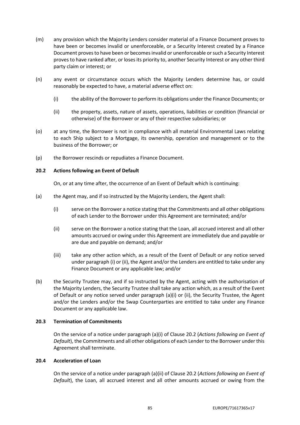 85 EUROPE/71617365v17 (m) any provision which the Majority Lenders consider material of a Finance Document proves to have been or becomes invalid or unenforceable, or a Security Interest created by a Finance Document proves to have been or becomes invalid or unenforceable or such a Security Interest proves to have ranked after, or loses its priority to, another Security Interest or any other third party claim or interest; or (n) any event or circumstance occurs which the Majority Lenders determine has, or could reasonably be expected to have, a material adverse effect on: (i) the ability of the Borrower to perform its obligations under the Finance Documents; or (ii) the property, assets, nature of assets, operations, liabilities or condition (financial or otherwise) of the Borrower or any of their respective subsidiaries; or (o) at any time, the Borrower is not in compliance with all material Environmental Laws relating to each Ship subject to a Mortgage, its ownership, operation and management or to the business of the Borrower; or (p) the Borrower rescinds or repudiates a Finance Document. 20.2 Actions following an Event of Default On, or at any time after, the occurrence of an Event of Default which is continuing: (a) the Agent may, and if so instructed by the Majority Lenders, the Agent shall: (i) serve on the Borrower a notice stating that the Commitments and all other obligations of each Lender to the Borrower under this Agreement are terminated; and/or (ii) serve on the Borrower a notice stating that the Loan, all accrued interest and all other amounts accrued or owing under this Agreement are immediately due and payable or are due and payable on demand; and/or (iii) take any other action which, as a result of the Event of Default or any notice served under paragraph (i) or (ii), the Agent and/or the Lenders are entitled to take under any Finance Document or any applicable law; and/or (b) the Security Trustee may, and if so instructed by the Agent, acting with the authorisation of the Majority Lenders, the Security Trustee shall take any action which, as a result of the Event of Default or any notice served under paragraph (a)(i) or (ii), the Security Trustee, the Agent and/or the Lenders and/or the Swap Counterparties are entitled to take under any Finance Document or any applicable law. 20.3 Termination of Commitments On the service of a notice under paragraph (a)(i) of Clause 20.2 (Actions following an Event of Default), the Commitments and all other obligations of each Lender to the Borrower under this Agreement shall terminate. 20.4 Acceleration of Loan On the service of a notice under paragraph (a)(ii) of Clause 20.2 (Actions following an Event of Default), the Loan, all accrued interest and all other amounts accrued or owing from the