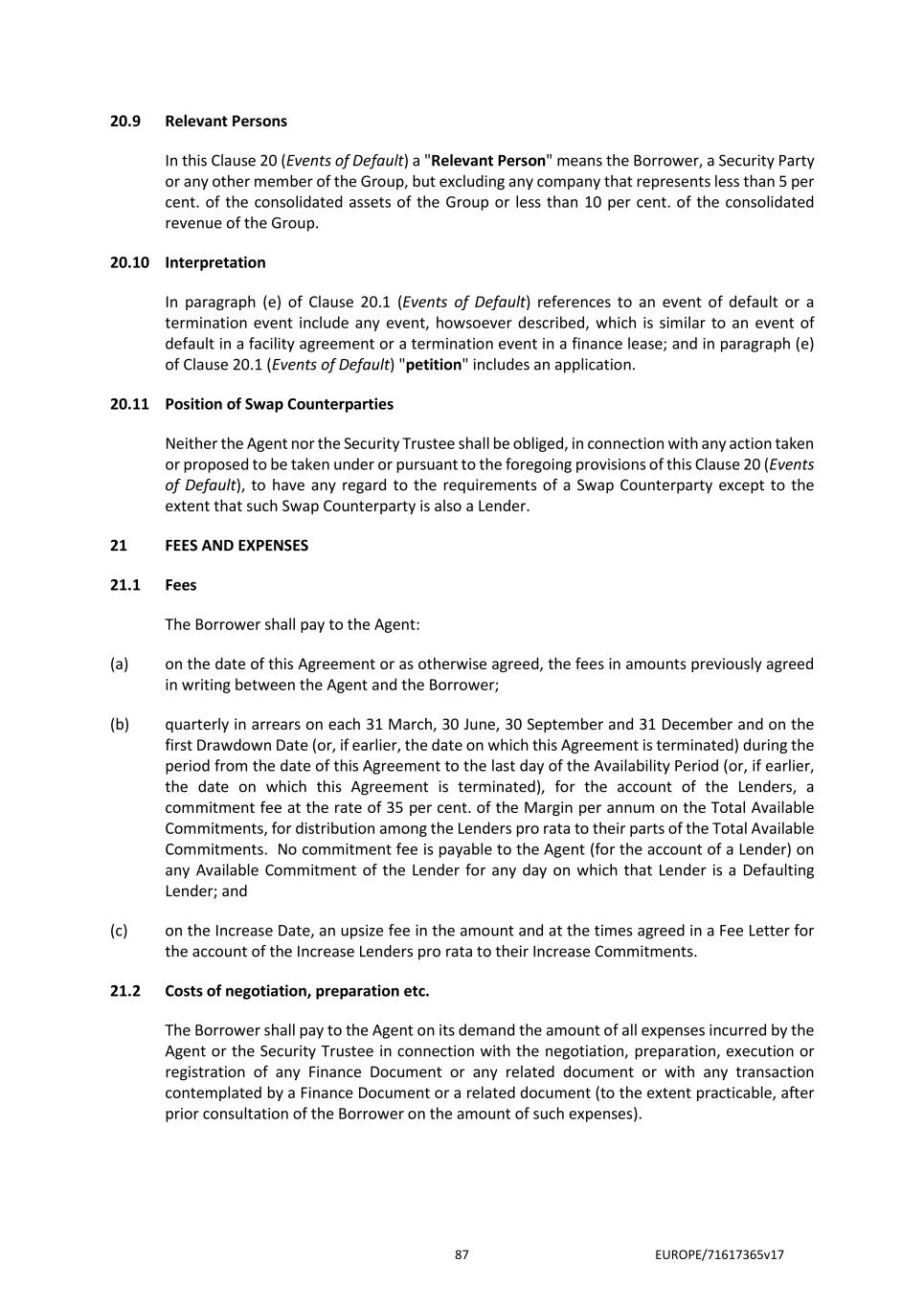 87 EUROPE/71617365v17 20.9 Relevant Persons In this Clause 20 (Events of Default) a "Relevant Person" means the Borrower, a Security Party or any other member of the Group, but excluding any company that represents less than 5 per cent. of the consolidated assets of the Group or less than 10 per cent. of the consolidated revenue of the Group. 20.10 Interpretation In paragraph (e) of Clause 20.1 (Events of Default) references to an event of default or a termination event include any event, howsoever described, which is similar to an event of default in a facility agreement or a termination event in a finance lease; and in paragraph (e) of Clause 20.1 (Events of Default) "petition" includes an application. 20.11 Position of Swap Counterparties Neither the Agent nor the Security Trustee shall be obliged, in connection with any action taken or proposed to be taken under or pursuant to the foregoing provisions of this Clause 20 (Events of Default), to have any regard to the requirements of a Swap Counterparty except to the extent that such Swap Counterparty is also a Lender. 21 FEES AND EXPENSES 21.1 Fees The Borrower shall pay to the Agent: (a) on the date of this Agreement or as otherwise agreed, the fees in amounts previously agreed in writing between the Agent and the Borrower; (b) quarterly in arrears on each 31 March, 30 June, 30 September and 31 December and on the first Drawdown Date (or, if earlier, the date on which this Agreement is terminated) during the period from the date of this Agreement to the last day of the Availability Period (or, if earlier, the date on which this Agreement is terminated), for the account of the Lenders, a commitment fee at the rate of 35 per cent. of the Margin per annum on the Total Available Commitments, for distribution among the Lenders pro rata to their parts of the Total Available Commitments. No commitment fee is payable to the Agent (for the account of a Lender) on any Available Commitment of the Lender for any day on which that Lender is a Defaulting Lender; and (c) on the Increase Date, an upsize fee in the amount and at the times agreed in a Fee Letter for the account of the Increase Lenders pro rata to their Increase Commitments. 21.2 Costs of negotiation, preparation etc. The Borrower shall pay to the Agent on its demand the amount of all expenses incurred by the Agent or the Security Trustee in connection with the negotiation, preparation, execution or registration of any Finance Document or any related document or with any transaction contemplated by a Finance Document or a related document (to the extent practicable, after prior consultation of the Borrower on the amount of such expenses).
