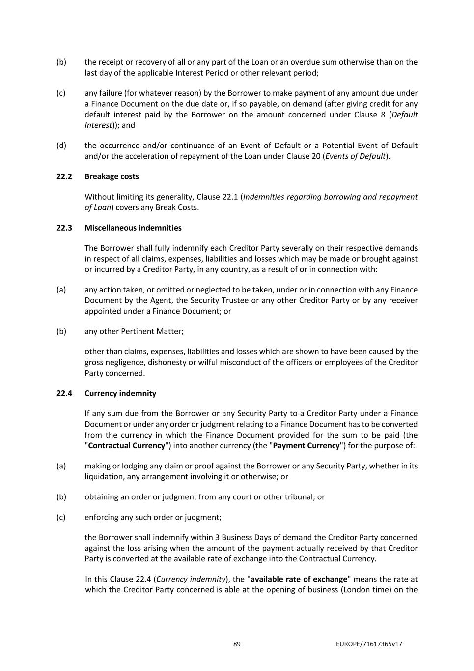 89 EUROPE/71617365v17 (b) the receipt or recovery of all or any part of the Loan or an overdue sum otherwise than on the last day of the applicable Interest Period or other relevant period; (c) any failure (for whatever reason) by the Borrower to make payment of any amount due under a Finance Document on the due date or, if so payable, on demand (after giving credit for any default interest paid by the Borrower on the amount concerned under Clause 8 (Default Interest)); and (d) the occurrence and/or continuance of an Event of Default or a Potential Event of Default and/or the acceleration of repayment of the Loan under Clause 20 (Events of Default). 22.2 Breakage costs Without limiting its generality, Clause 22.1 (Indemnities regarding borrowing and repayment of Loan) covers any Break Costs. 22.3 Miscellaneous indemnities The Borrower shall fully indemnify each Creditor Party severally on their respective demands in respect of all claims, expenses, liabilities and losses which may be made or brought against or incurred by a Creditor Party, in any country, as a result of or in connection with: (a) any action taken, or omitted or neglected to be taken, under or in connection with any Finance Document by the Agent, the Security Trustee or any other Creditor Party or by any receiver appointed under a Finance Document; or (b) any other Pertinent Matter; other than claims, expenses, liabilities and losses which are shown to have been caused by the gross negligence, dishonesty or wilful misconduct of the officers or employees of the Creditor Party concerned. 22.4 Currency indemnity If any sum due from the Borrower or any Security Party to a Creditor Party under a Finance Document or under any order or judgment relating to a Finance Document has to be converted from the currency in which the Finance Document provided for the sum to be paid (the "Contractual Currency") into another currency (the "Payment Currency") for the purpose of: (a) making or lodging any claim or proof against the Borrower or any Security Party, whether in its liquidation, any arrangement involving it or otherwise; or (b) obtaining an order or judgment from any court or other tribunal; or (c) enforcing any such order or judgment; the Borrower shall indemnify within 3 Business Days of demand the Creditor Party concerned against the loss arising when the amount of the payment actually received by that Creditor Party is converted at the available rate of exchange into the Contractual Currency. In this Clause 22.4 (Currency indemnity), the "available rate of exchange" means the rate at which the Creditor Party concerned is able at the opening of business (London time) on the