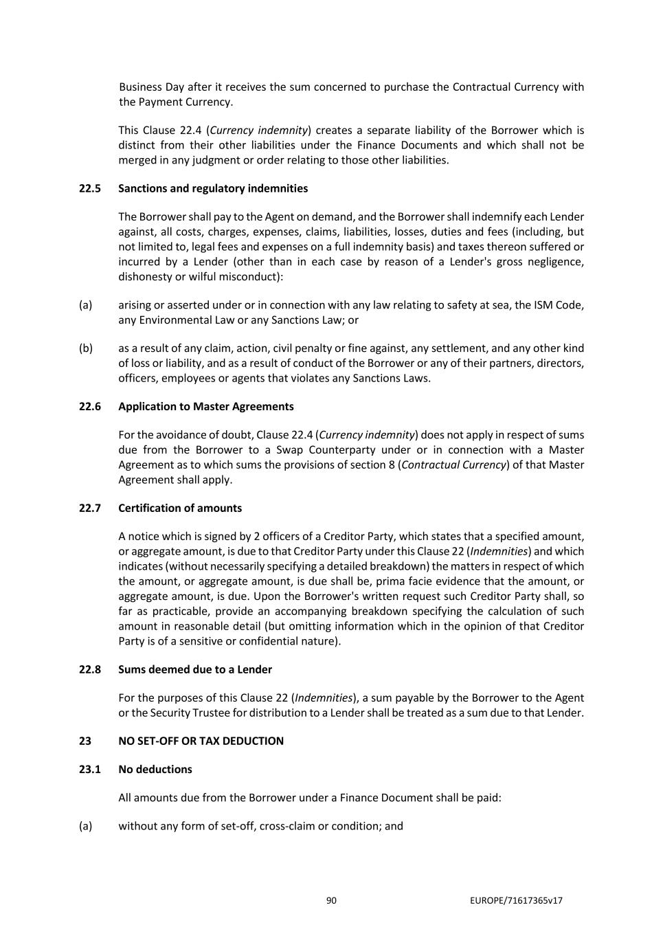 90 EUROPE/71617365v17 Business Day after it receives the sum concerned to purchase the Contractual Currency with the Payment Currency. This Clause 22.4 (Currency indemnity) creates a separate liability of the Borrower which is distinct from their other liabilities under the Finance Documents and which shall not be merged in any judgment or order relating to those other liabilities. 22.5 Sanctions and regulatory indemnities The Borrower shall pay to the Agent on demand, and the Borrower shall indemnify each Lender against, all costs, charges, expenses, claims, liabilities, losses, duties and fees (including, but not limited to, legal fees and expenses on a full indemnity basis) and taxes thereon suffered or incurred by a Lender (other than in each case by reason of a Lender's gross negligence, dishonesty or wilful misconduct): (a) arising or asserted under or in connection with any law relating to safety at sea, the ISM Code, any Environmental Law or any Sanctions Law; or (b) as a result of any claim, action, civil penalty or fine against, any settlement, and any other kind of loss or liability, and as a result of conduct of the Borrower or any of their partners, directors, officers, employees or agents that violates any Sanctions Laws. 22.6 Application to Master Agreements For the avoidance of doubt, Clause 22.4 (Currency indemnity) does not apply in respect of sums due from the Borrower to a Swap Counterparty under or in connection with a Master Agreement as to which sums the provisions of section 8 (Contractual Currency) of that Master Agreement shall apply. 22.7 Certification of amounts A notice which is signed by 2 officers of a Creditor Party, which states that a specified amount, or aggregate amount, is due to that Creditor Party under this Clause 22 (Indemnities) and which indicates (without necessarily specifying a detailed breakdown) the matters in respect of which the amount, or aggregate amount, is due shall be, prima facie evidence that the amount, or aggregate amount, is due. Upon the Borrower's written request such Creditor Party shall, so far as practicable, provide an accompanying breakdown specifying the calculation of such amount in reasonable detail (but omitting information which in the opinion of that Creditor Party is of a sensitive or confidential nature). 22.8 Sums deemed due to a Lender For the purposes of this Clause 22 (Indemnities), a sum payable by the Borrower to the Agent or the Security Trustee for distribution to a Lender shall be treated as a sum due to that Lender. 23 NO SET-OFF OR TAX DEDUCTION 23.1 No deductions All amounts due from the Borrower under a Finance Document shall be paid: (a) without any form of set-off, cross-claim or condition; and
