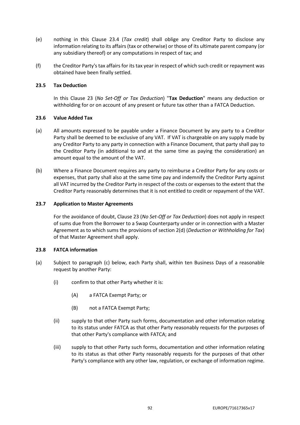 92 EUROPE/71617365v17 (e) nothing in this Clause 23.4 (Tax credit) shall oblige any Creditor Party to disclose any information relating to its affairs (tax or otherwise) or those of its ultimate parent company (or any subsidiary thereof) or any computations in respect of tax; and (f) the Creditor Party's tax affairs for its tax year in respect of which such credit or repayment was obtained have been finally settled. 23.5 Tax Deduction In this Clause 23 (No Set-Off or Tax Deduction) "Tax Deduction" means any deduction or withholding for or on account of any present or future tax other than a FATCA Deduction. 23.6 Value Added Tax (a) All amounts expressed to be payable under a Finance Document by any party to a Creditor Party shall be deemed to be exclusive of any VAT. If VAT is chargeable on any supply made by any Creditor Party to any party in connection with a Finance Document, that party shall pay to the Creditor Party (in additional to and at the same time as paying the consideration) an amount equal to the amount of the VAT. (b) Where a Finance Document requires any party to reimburse a Creditor Party for any costs or expenses, that party shall also at the same time pay and indemnify the Creditor Party against all VAT incurred by the Creditor Party in respect of the costs or expenses to the extent that the Creditor Party reasonably determines that it is not entitled to credit or repayment of the VAT. 23.7 Application to Master Agreements For the avoidance of doubt, Clause 23 (No Set-Off or Tax Deduction) does not apply in respect of sums due from the Borrower to a Swap Counterparty under or in connection with a Master Agreement as to which sums the provisions of section 2(d) (Deduction or Withholding for Tax) of that Master Agreement shall apply. 23.8 FATCA information (a) Subject to paragraph (c) below, each Party shall, within ten Business Days of a reasonable request by another Party: (i) confirm to that other Party whether it is: (A) a FATCA Exempt Party; or (B) not a FATCA Exempt Party; (ii) supply to that other Party such forms, documentation and other information relating to its status under FATCA as that other Party reasonably requests for the purposes of that other Party's compliance with FATCA; and (iii) supply to that other Party such forms, documentation and other information relating to its status as that other Party reasonably requests for the purposes of that other Party's compliance with any other law, regulation, or exchange of information regime.