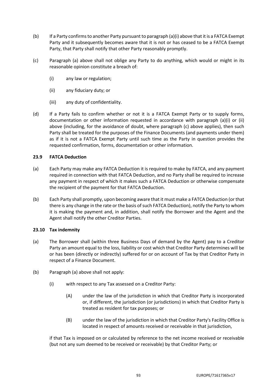 93 EUROPE/71617365v17 (b) If a Party confirms to another Party pursuant to paragraph (a)(i) above that it is a FATCA Exempt Party and it subsequently becomes aware that it is not or has ceased to be a FATCA Exempt Party, that Party shall notify that other Party reasonably promptly. (c) Paragraph (a) above shall not oblige any Party to do anything, which would or might in its reasonable opinion constitute a breach of: (i) any law or regulation; (ii) any fiduciary duty; or (iii) any duty of confidentiality. (d) If a Party fails to confirm whether or not it is a FATCA Exempt Party or to supply forms, documentation or other information requested in accordance with paragraph (a)(i) or (ii) above (including, for the avoidance of doubt, where paragraph (c) above applies), then such Party shall be treated for the purposes of the Finance Documents (and payments under them) as if it is not a FATCA Exempt Party until such time as the Party in question provides the requested confirmation, forms, documentation or other information. 23.9 FATCA Deduction (a) Each Party may make any FATCA Deduction it is required to make by FATCA, and any payment required in connection with that FATCA Deduction, and no Party shall be required to increase any payment in respect of which it makes such a FATCA Deduction or otherwise compensate the recipient of the payment for that FATCA Deduction. (b) Each Party shall promptly, upon becoming aware that it must make a FATCA Deduction (or that there is any change in the rate or the basis of such FATCA Deduction), notify the Party to whom it is making the payment and, in addition, shall notify the Borrower and the Agent and the Agent shall notify the other Creditor Parties. 23.10 Tax indemnity (a) The Borrower shall (within three Business Days of demand by the Agent) pay to a Creditor Party an amount equal to the loss, liability or cost which that Creditor Party determines will be or has been (directly or indirectly) suffered for or on account of Tax by that Creditor Party in respect of a Finance Document. (b) Paragraph (a) above shall not apply: (i) with respect to any Tax assessed on a Creditor Party: (A) under the law of the jurisdiction in which that Creditor Party is incorporated or, if different, the jurisdiction (or jurisdictions) in which that Creditor Party is treated as resident for tax purposes; or (B) under the law of the jurisdiction in which that Creditor Party's Facility Office is located in respect of amounts received or receivable in that jurisdiction, if that Tax is imposed on or calculated by reference to the net income received or receivable (but not any sum deemed to be received or receivable) by that Creditor Party; or