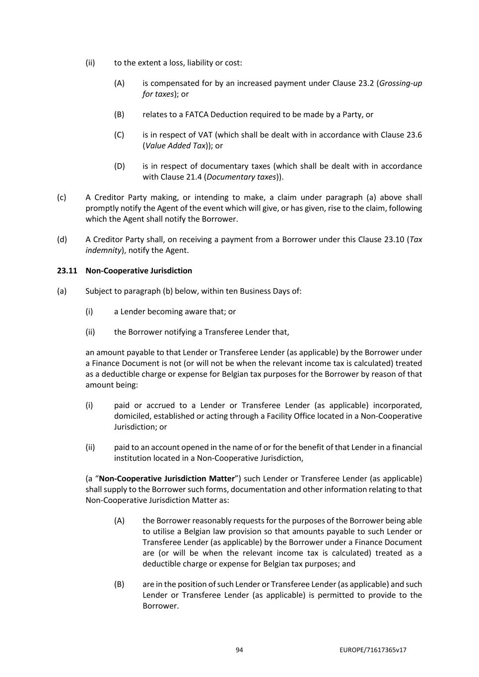94 EUROPE/71617365v17 (ii) to the extent a loss, liability or cost: (A) is compensated for by an increased payment under Clause 23.2 (Grossing-up for taxes); or (B) relates to a FATCA Deduction required to be made by a Party, or (C) is in respect of VAT (which shall be dealt with in accordance with Clause 23.6 (Value Added Tax)); or (D) is in respect of documentary taxes (which shall be dealt with in accordance with Clause 21.4 (Documentary taxes)). (c) A Creditor Party making, or intending to make, a claim under paragraph (a) above shall promptly notify the Agent of the event which will give, or has given, rise to the claim, following which the Agent shall notify the Borrower. (d) A Creditor Party shall, on receiving a payment from a Borrower under this Clause 23.10 (Tax indemnity), notify the Agent. 23.11 Non-Cooperative Jurisdiction (a) Subject to paragraph (b) below, within ten Business Days of: (i) a Lender becoming aware that; or (ii) the Borrower notifying a Transferee Lender that, an amount payable to that Lender or Transferee Lender (as applicable) by the Borrower under a Finance Document is not (or will not be when the relevant income tax is calculated) treated as a deductible charge or expense for Belgian tax purposes for the Borrower by reason of that amount being: (i) paid or accrued to a Lender or Transferee Lender (as applicable) incorporated, domiciled, established or acting through a Facility Office located in a Non-Cooperative Jurisdiction; or (ii) paid to an account opened in the name of or for the benefit of that Lender in a financial institution located in a Non-Cooperative Jurisdiction, (a “Non-Cooperative Jurisdiction Matter”) such Lender or Transferee Lender (as applicable) shall supply to the Borrower such forms, documentation and other information relating to that Non-Cooperative Jurisdiction Matter as: (A) the Borrower reasonably requests for the purposes of the Borrower being able to utilise a Belgian law provision so that amounts payable to such Lender or Transferee Lender (as applicable) by the Borrower under a Finance Document are (or will be when the relevant income tax is calculated) treated as a deductible charge or expense for Belgian tax purposes; and (B) are in the position of such Lender or Transferee Lender (as applicable) and such Lender or Transferee Lender (as applicable) is permitted to provide to the Borrower.