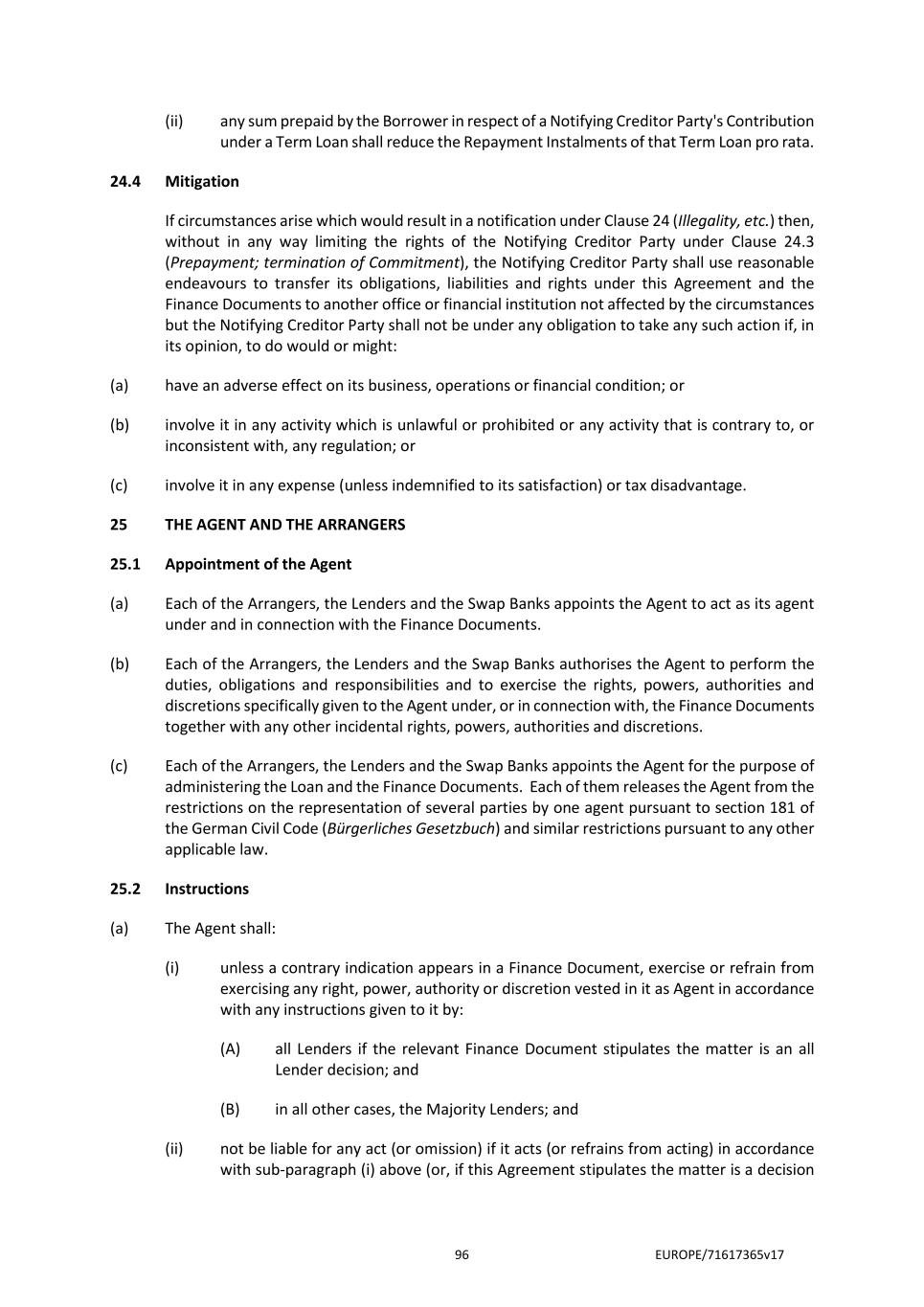 96 EUROPE/71617365v17 (ii) any sum prepaid by the Borrower in respect of a Notifying Creditor Party's Contribution under a Term Loan shall reduce the Repayment Instalments of that Term Loan pro rata. 24.4 Mitigation If circumstances arise which would result in a notification under Clause 24 (Illegality, etc.) then, without in any way limiting the rights of the Notifying Creditor Party under Clause 24.3 (Prepayment; termination of Commitment), the Notifying Creditor Party shall use reasonable endeavours to transfer its obligations, liabilities and rights under this Agreement and the Finance Documents to another office or financial institution not affected by the circumstances but the Notifying Creditor Party shall not be under any obligation to take any such action if, in its opinion, to do would or might: (a) have an adverse effect on its business, operations or financial condition; or (b) involve it in any activity which is unlawful or prohibited or any activity that is contrary to, or inconsistent with, any regulation; or (c) involve it in any expense (unless indemnified to its satisfaction) or tax disadvantage. 25 THE AGENT AND THE ARRANGERS 25.1 Appointment of the Agent (a) Each of the Arrangers, the Lenders and the Swap Banks appoints the Agent to act as its agent under and in connection with the Finance Documents. (b) Each of the Arrangers, the Lenders and the Swap Banks authorises the Agent to perform the duties, obligations and responsibilities and to exercise the rights, powers, authorities and discretions specifically given to the Agent under, or in connection with, the Finance Documents together with any other incidental rights, powers, authorities and discretions. (c) Each of the Arrangers, the Lenders and the Swap Banks appoints the Agent for the purpose of administering the Loan and the Finance Documents. Each of them releases the Agent from the restrictions on the representation of several parties by one agent pursuant to section 181 of the German Civil Code (Bürgerliches Gesetzbuch) and similar restrictions pursuant to any other applicable law. 25.2 Instructions (a) The Agent shall: (i) unless a contrary indication appears in a Finance Document, exercise or refrain from exercising any right, power, authority or discretion vested in it as Agent in accordance with any instructions given to it by: (A) all Lenders if the relevant Finance Document stipulates the matter is an all Lender decision; and (B) in all other cases, the Majority Lenders; and (ii) not be liable for any act (or omission) if it acts (or refrains from acting) in accordance with sub-paragraph (i) above (or, if this Agreement stipulates the matter is a decision