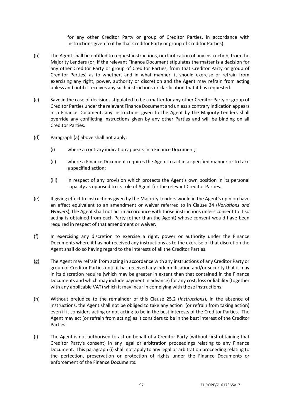 97 EUROPE/71617365v17 for any other Creditor Party or group of Creditor Parties, in accordance with instructions given to it by that Creditor Party or group of Creditor Parties). (b) The Agent shall be entitled to request instructions, or clarification of any instruction, from the Majority Lenders (or, if the relevant Finance Document stipulates the matter is a decision for any other Creditor Party or group of Creditor Parties, from that Creditor Party or group of Creditor Parties) as to whether, and in what manner, it should exercise or refrain from exercising any right, power, authority or discretion and the Agent may refrain from acting unless and until it receives any such instructions or clarification that it has requested. (c) Save in the case of decisions stipulated to be a matter for any other Creditor Party or group of Creditor Parties under the relevant Finance Document and unless a contrary indication appears in a Finance Document, any instructions given to the Agent by the Majority Lenders shall override any conflicting instructions given by any other Parties and will be binding on all Creditor Parties. (d) Paragraph (a) above shall not apply: (i) where a contrary indication appears in a Finance Document; (ii) where a Finance Document requires the Agent to act in a specified manner or to take a specified action; (iii) in respect of any provision which protects the Agent's own position in its personal capacity as opposed to its role of Agent for the relevant Creditor Parties. (e) If giving effect to instructions given by the Majority Lenders would in the Agent's opinion have an effect equivalent to an amendment or waiver referred to in Clause 34 (Variations and Waivers), the Agent shall not act in accordance with those instructions unless consent to it so acting is obtained from each Party (other than the Agent) whose consent would have been required in respect of that amendment or waiver. (f) In exercising any discretion to exercise a right, power or authority under the Finance Documents where it has not received any instructions as to the exercise of that discretion the Agent shall do so having regard to the interests of all the Creditor Parties. (g) The Agent may refrain from acting in accordance with any instructions of any Creditor Party or group of Creditor Parties until it has received any indemnification and/or security that it may in its discretion require (which may be greater in extent than that contained in the Finance Documents and which may include payment in advance) for any cost, loss or liability (together with any applicable VAT) which it may incur in complying with those instructions. (h) Without prejudice to the remainder of this Clause 25.2 (Instructions), in the absence of instructions, the Agent shall not be obliged to take any action (or refrain from taking action) even if it considers acting or not acting to be in the best interests of the Creditor Parties. The Agent may act (or refrain from acting) as it considers to be in the best interest of the Creditor Parties. (i) The Agent is not authorised to act on behalf of a Creditor Party (without first obtaining that Creditor Party's consent) in any legal or arbitration proceedings relating to any Finance Document. This paragraph (i) shall not apply to any legal or arbitration proceeding relating to the perfection, preservation or protection of rights under the Finance Documents or enforcement of the Finance Documents.