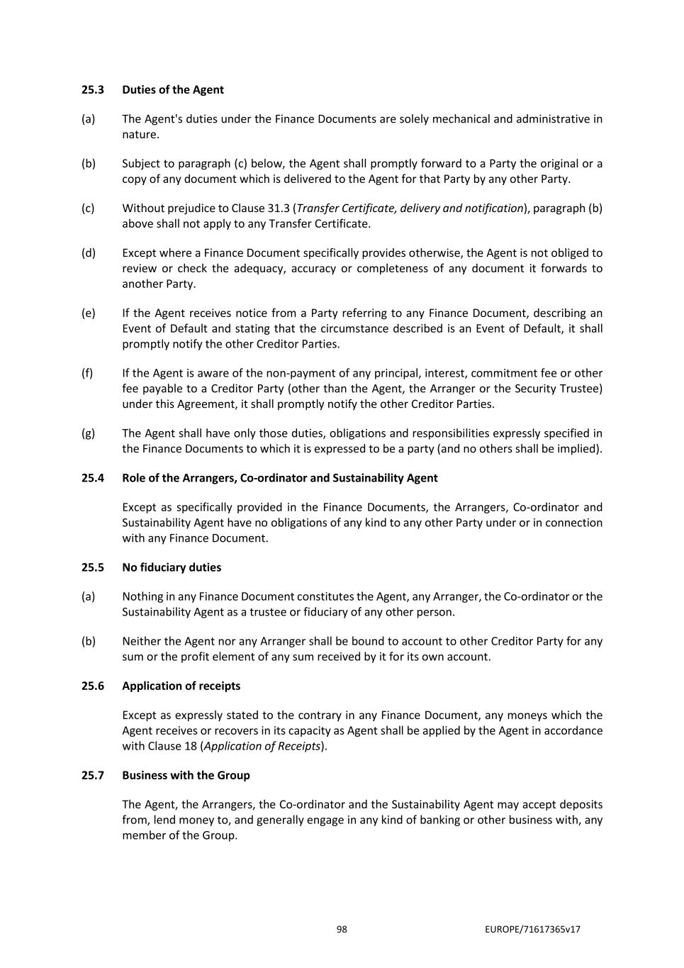 98 EUROPE/71617365v17 25.3 Duties of the Agent (a) The Agent's duties under the Finance Documents are solely mechanical and administrative in nature. (b) Subject to paragraph (c) below, the Agent shall promptly forward to a Party the original or a copy of any document which is delivered to the Agent for that Party by any other Party. (c) Without prejudice to Clause 31.3 (Transfer Certificate, delivery and notification), paragraph (b) above shall not apply to any Transfer Certificate. (d) Except where a Finance Document specifically provides otherwise, the Agent is not obliged to review or check the adequacy, accuracy or completeness of any document it forwards to another Party. (e) If the Agent receives notice from a Party referring to any Finance Document, describing an Event of Default and stating that the circumstance described is an Event of Default, it shall promptly notify the other Creditor Parties. (f) If the Agent is aware of the non-payment of any principal, interest, commitment fee or other fee payable to a Creditor Party (other than the Agent, the Arranger or the Security Trustee) under this Agreement, it shall promptly notify the other Creditor Parties. (g) The Agent shall have only those duties, obligations and responsibilities expressly specified in the Finance Documents to which it is expressed to be a party (and no others shall be implied). 25.4 Role of the Arrangers, Co-ordinator and Sustainability Agent Except as specifically provided in the Finance Documents, the Arrangers, Co-ordinator and Sustainability Agent have no obligations of any kind to any other Party under or in connection with any Finance Document. 25.5 No fiduciary duties (a) Nothing in any Finance Document constitutes the Agent, any Arranger, the Co-ordinator or the Sustainability Agent as a trustee or fiduciary of any other person. (b) Neither the Agent nor any Arranger shall be bound to account to other Creditor Party for any sum or the profit element of any sum received by it for its own account. 25.6 Application of receipts Except as expressly stated to the contrary in any Finance Document, any moneys which the Agent receives or recovers in its capacity as Agent shall be applied by the Agent in accordance with Clause 18 (Application of Receipts). 25.7 Business with the Group The Agent, the Arrangers, the Co-ordinator and the Sustainability Agent may accept deposits from, lend money to, and generally engage in any kind of banking or other business with, any member of the Group.