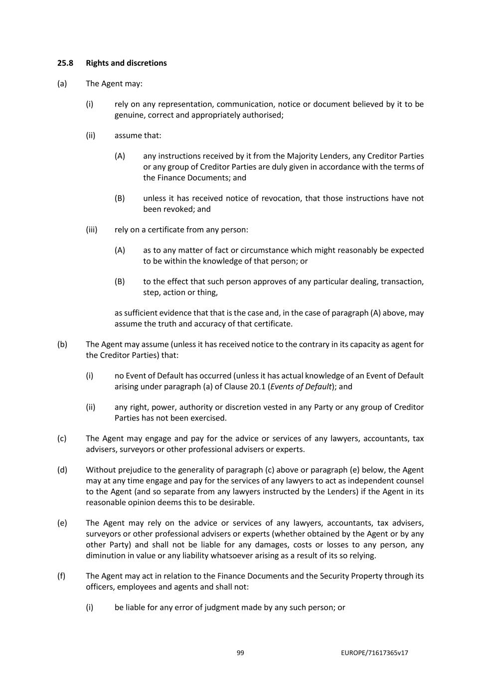 99 EUROPE/71617365v17 25.8 Rights and discretions (a) The Agent may: (i) rely on any representation, communication, notice or document believed by it to be genuine, correct and appropriately authorised; (ii) assume that: (A) any instructions received by it from the Majority Lenders, any Creditor Parties or any group of Creditor Parties are duly given in accordance with the terms of the Finance Documents; and (B) unless it has received notice of revocation, that those instructions have not been revoked; and (iii) rely on a certificate from any person: (A) as to any matter of fact or circumstance which might reasonably be expected to be within the knowledge of that person; or (B) to the effect that such person approves of any particular dealing, transaction, step, action or thing, as sufficient evidence that that is the case and, in the case of paragraph (A) above, may assume the truth and accuracy of that certificate. (b) The Agent may assume (unless it has received notice to the contrary in its capacity as agent for the Creditor Parties) that: (i) no Event of Default has occurred (unless it has actual knowledge of an Event of Default arising under paragraph (a) of Clause 20.1 (Events of Default); and (ii) any right, power, authority or discretion vested in any Party or any group of Creditor Parties has not been exercised. (c) The Agent may engage and pay for the advice or services of any lawyers, accountants, tax advisers, surveyors or other professional advisers or experts. (d) Without prejudice to the generality of paragraph (c) above or paragraph (e) below, the Agent may at any time engage and pay for the services of any lawyers to act as independent counsel to the Agent (and so separate from any lawyers instructed by the Lenders) if the Agent in its reasonable opinion deems this to be desirable. (e) The Agent may rely on the advice or services of any lawyers, accountants, tax advisers, surveyors or other professional advisers or experts (whether obtained by the Agent or by any other Party) and shall not be liable for any damages, costs or losses to any person, any diminution in value or any liability whatsoever arising as a result of its so relying. (f) The Agent may act in relation to the Finance Documents and the Security Property through its officers, employees and agents and shall not: (i) be liable for any error of judgment made by any such person; or