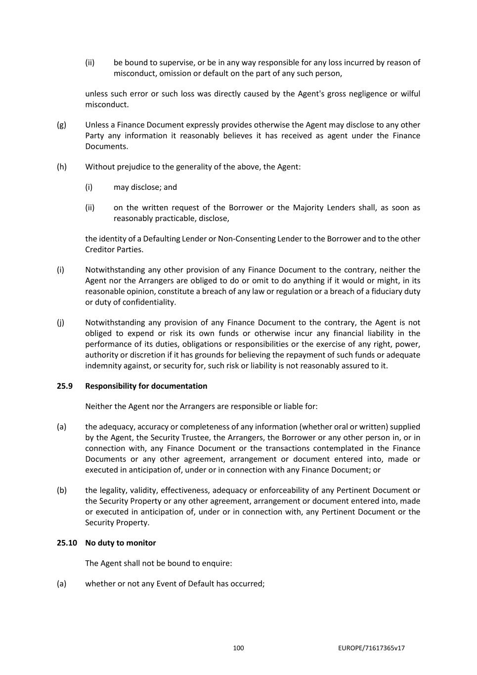 100 EUROPE/71617365v17 (ii) be bound to supervise, or be in any way responsible for any loss incurred by reason of misconduct, omission or default on the part of any such person, unless such error or such loss was directly caused by the Agent's gross negligence or wilful misconduct. (g) Unless a Finance Document expressly provides otherwise the Agent may disclose to any other Party any information it reasonably believes it has received as agent under the Finance Documents. (h) Without prejudice to the generality of the above, the Agent: (i) may disclose; and (ii) on the written request of the Borrower or the Majority Lenders shall, as soon as reasonably practicable, disclose, the identity of a Defaulting Lender or Non-Consenting Lender to the Borrower and to the other Creditor Parties. (i) Notwithstanding any other provision of any Finance Document to the contrary, neither the Agent nor the Arrangers are obliged to do or omit to do anything if it would or might, in its reasonable opinion, constitute a breach of any law or regulation or a breach of a fiduciary duty or duty of confidentiality. (j) Notwithstanding any provision of any Finance Document to the contrary, the Agent is not obliged to expend or risk its own funds or otherwise incur any financial liability in the performance of its duties, obligations or responsibilities or the exercise of any right, power, authority or discretion if it has grounds for believing the repayment of such funds or adequate indemnity against, or security for, such risk or liability is not reasonably assured to it. 25.9 Responsibility for documentation Neither the Agent nor the Arrangers are responsible or liable for: (a) the adequacy, accuracy or completeness of any information (whether oral or written) supplied by the Agent, the Security Trustee, the Arrangers, the Borrower or any other person in, or in connection with, any Finance Document or the transactions contemplated in the Finance Documents or any other agreement, arrangement or document entered into, made or executed in anticipation of, under or in connection with any Finance Document; or (b) the legality, validity, effectiveness, adequacy or enforceability of any Pertinent Document or the Security Property or any other agreement, arrangement or document entered into, made or executed in anticipation of, under or in connection with, any Pertinent Document or the Security Property. 25.10 No duty to monitor The Agent shall not be bound to enquire: (a) whether or not any Event of Default has occurred;