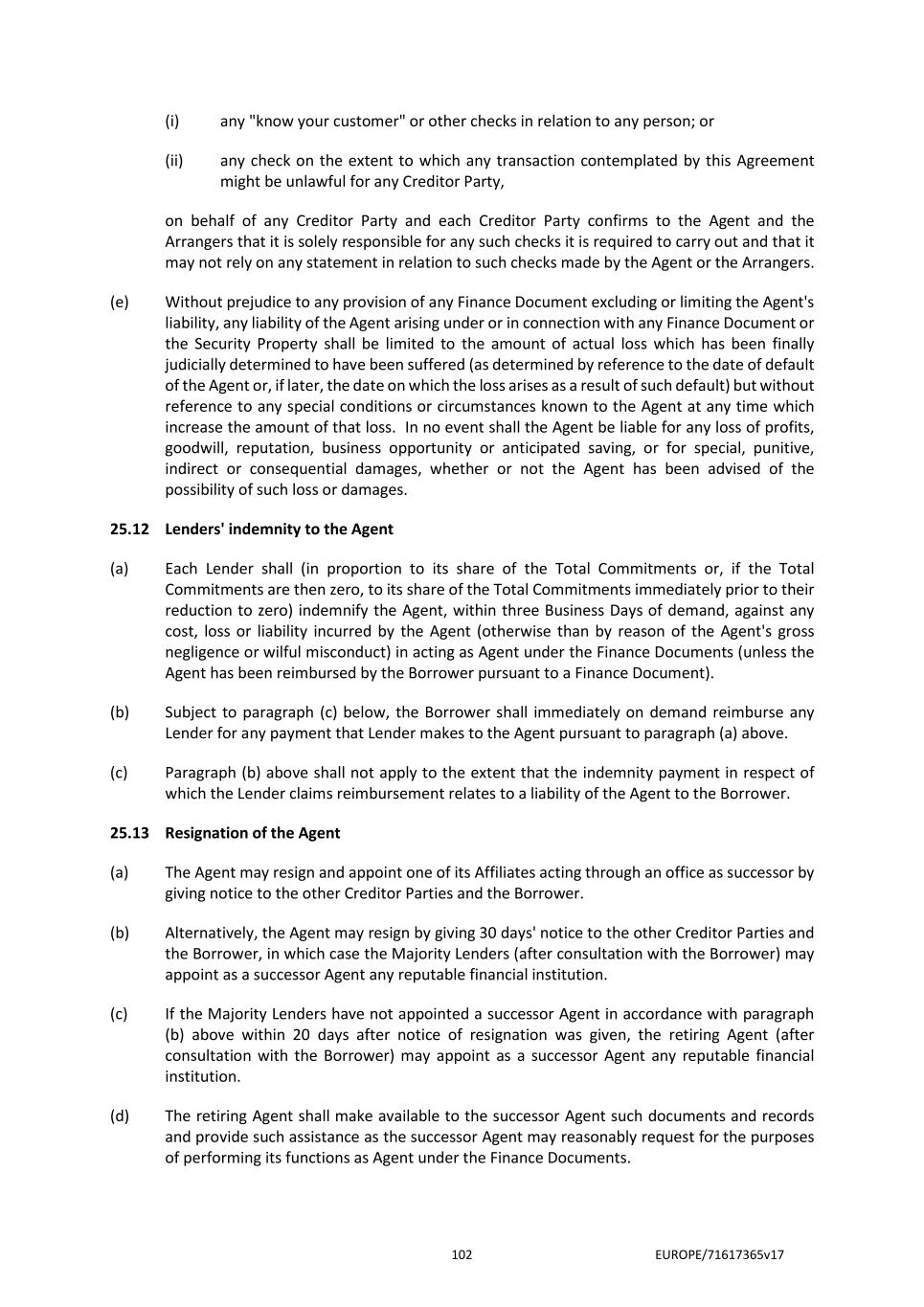 102 EUROPE/71617365v17 (i) any "know your customer" or other checks in relation to any person; or (ii) any check on the extent to which any transaction contemplated by this Agreement might be unlawful for any Creditor Party, on behalf of any Creditor Party and each Creditor Party confirms to the Agent and the Arrangers that it is solely responsible for any such checks it is required to carry out and that it may not rely on any statement in relation to such checks made by the Agent or the Arrangers. (e) Without prejudice to any provision of any Finance Document excluding or limiting the Agent's liability, any liability of the Agent arising under or in connection with any Finance Document or the Security Property shall be limited to the amount of actual loss which has been finally judicially determined to have been suffered (as determined by reference to the date of default of the Agent or, if later, the date on which the loss arises as a result of such default) but without reference to any special conditions or circumstances known to the Agent at any time which increase the amount of that loss. In no event shall the Agent be liable for any loss of profits, goodwill, reputation, business opportunity or anticipated saving, or for special, punitive, indirect or consequential damages, whether or not the Agent has been advised of the possibility of such loss or damages. 25.12 Lenders' indemnity to the Agent (a) Each Lender shall (in proportion to its share of the Total Commitments or, if the Total Commitments are then zero, to its share of the Total Commitments immediately prior to their reduction to zero) indemnify the Agent, within three Business Days of demand, against any cost, loss or liability incurred by the Agent (otherwise than by reason of the Agent's gross negligence or wilful misconduct) in acting as Agent under the Finance Documents (unless the Agent has been reimbursed by the Borrower pursuant to a Finance Document). (b) Subject to paragraph (c) below, the Borrower shall immediately on demand reimburse any Lender for any payment that Lender makes to the Agent pursuant to paragraph (a) above. (c) Paragraph (b) above shall not apply to the extent that the indemnity payment in respect of which the Lender claims reimbursement relates to a liability of the Agent to the Borrower. 25.13 Resignation of the Agent (a) The Agent may resign and appoint one of its Affiliates acting through an office as successor by giving notice to the other Creditor Parties and the Borrower. (b) Alternatively, the Agent may resign by giving 30 days' notice to the other Creditor Parties and the Borrower, in which case the Majority Lenders (after consultation with the Borrower) may appoint as a successor Agent any reputable financial institution. (c) If the Majority Lenders have not appointed a successor Agent in accordance with paragraph (b) above within 20 days after notice of resignation was given, the retiring Agent (after consultation with the Borrower) may appoint as a successor Agent any reputable financial institution. (d) The retiring Agent shall make available to the successor Agent such documents and records and provide such assistance as the successor Agent may reasonably request for the purposes of performing its functions as Agent under the Finance Documents.