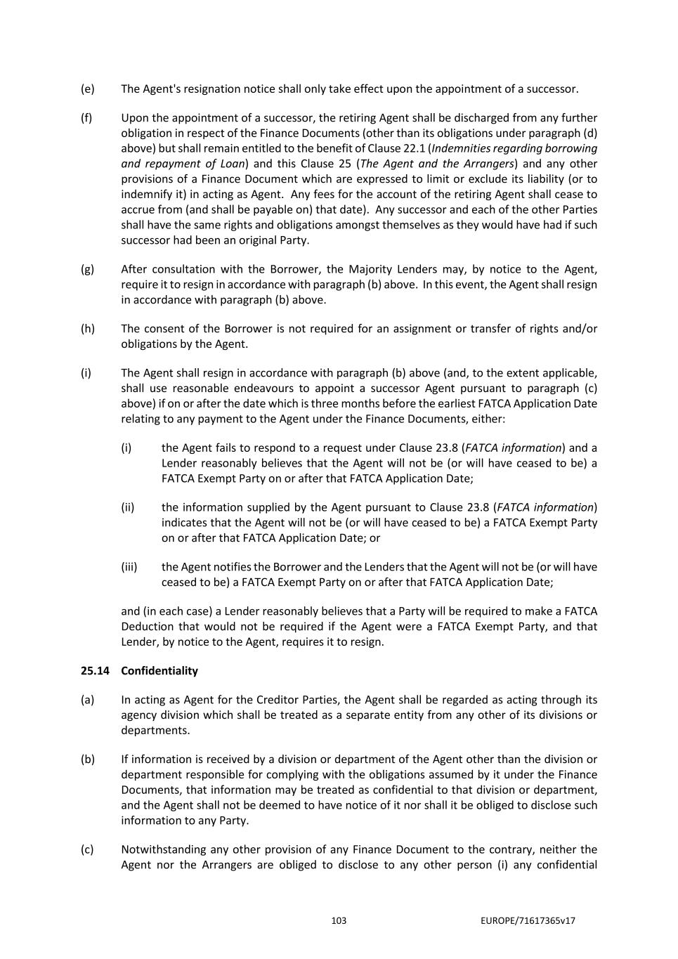 103 EUROPE/71617365v17 (e) The Agent's resignation notice shall only take effect upon the appointment of a successor. (f) Upon the appointment of a successor, the retiring Agent shall be discharged from any further obligation in respect of the Finance Documents (other than its obligations under paragraph (d) above) but shall remain entitled to the benefit of Clause 22.1 (Indemnities regarding borrowing and repayment of Loan) and this Clause 25 (The Agent and the Arrangers) and any other provisions of a Finance Document which are expressed to limit or exclude its liability (or to indemnify it) in acting as Agent. Any fees for the account of the retiring Agent shall cease to accrue from (and shall be payable on) that date). Any successor and each of the other Parties shall have the same rights and obligations amongst themselves as they would have had if such successor had been an original Party. (g) After consultation with the Borrower, the Majority Lenders may, by notice to the Agent, require it to resign in accordance with paragraph (b) above. In this event, the Agent shall resign in accordance with paragraph (b) above. (h) The consent of the Borrower is not required for an assignment or transfer of rights and/or obligations by the Agent. (i) The Agent shall resign in accordance with paragraph (b) above (and, to the extent applicable, shall use reasonable endeavours to appoint a successor Agent pursuant to paragraph (c) above) if on or after the date which is three months before the earliest FATCA Application Date relating to any payment to the Agent under the Finance Documents, either: (i) the Agent fails to respond to a request under Clause 23.8 (FATCA information) and a Lender reasonably believes that the Agent will not be (or will have ceased to be) a FATCA Exempt Party on or after that FATCA Application Date; (ii) the information supplied by the Agent pursuant to Clause 23.8 (FATCA information) indicates that the Agent will not be (or will have ceased to be) a FATCA Exempt Party on or after that FATCA Application Date; or (iii) the Agent notifies the Borrower and the Lenders that the Agent will not be (or will have ceased to be) a FATCA Exempt Party on or after that FATCA Application Date; and (in each case) a Lender reasonably believes that a Party will be required to make a FATCA Deduction that would not be required if the Agent were a FATCA Exempt Party, and that Lender, by notice to the Agent, requires it to resign. 25.14 Confidentiality (a) In acting as Agent for the Creditor Parties, the Agent shall be regarded as acting through its agency division which shall be treated as a separate entity from any other of its divisions or departments. (b) If information is received by a division or department of the Agent other than the division or department responsible for complying with the obligations assumed by it under the Finance Documents, that information may be treated as confidential to that division or department, and the Agent shall not be deemed to have notice of it nor shall it be obliged to disclose such information to any Party. (c) Notwithstanding any other provision of any Finance Document to the contrary, neither the Agent nor the Arrangers are obliged to disclose to any other person (i) any confidential