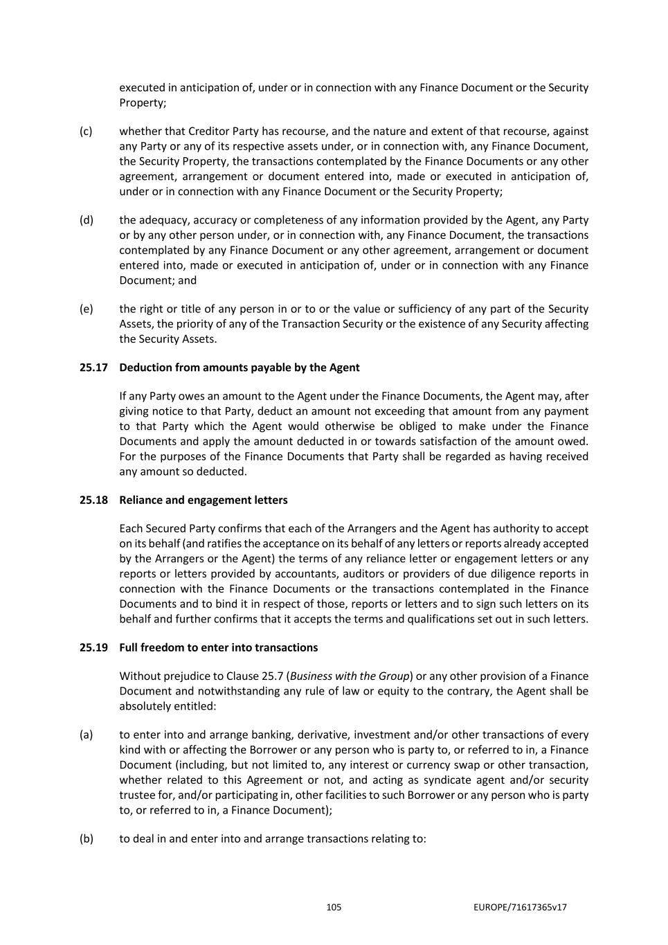 105 EUROPE/71617365v17 executed in anticipation of, under or in connection with any Finance Document or the Security Property; (c) whether that Creditor Party has recourse, and the nature and extent of that recourse, against any Party or any of its respective assets under, or in connection with, any Finance Document, the Security Property, the transactions contemplated by the Finance Documents or any other agreement, arrangement or document entered into, made or executed in anticipation of, under or in connection with any Finance Document or the Security Property; (d) the adequacy, accuracy or completeness of any information provided by the Agent, any Party or by any other person under, or in connection with, any Finance Document, the transactions contemplated by any Finance Document or any other agreement, arrangement or document entered into, made or executed in anticipation of, under or in connection with any Finance Document; and (e) the right or title of any person in or to or the value or sufficiency of any part of the Security Assets, the priority of any of the Transaction Security or the existence of any Security affecting the Security Assets. 25.17 Deduction from amounts payable by the Agent If any Party owes an amount to the Agent under the Finance Documents, the Agent may, after giving notice to that Party, deduct an amount not exceeding that amount from any payment to that Party which the Agent would otherwise be obliged to make under the Finance Documents and apply the amount deducted in or towards satisfaction of the amount owed. For the purposes of the Finance Documents that Party shall be regarded as having received any amount so deducted. 25.18 Reliance and engagement letters Each Secured Party confirms that each of the Arrangers and the Agent has authority to accept on its behalf (and ratifies the acceptance on its behalf of any letters or reports already accepted by the Arrangers or the Agent) the terms of any reliance letter or engagement letters or any reports or letters provided by accountants, auditors or providers of due diligence reports in connection with the Finance Documents or the transactions contemplated in the Finance Documents and to bind it in respect of those, reports or letters and to sign such letters on its behalf and further confirms that it accepts the terms and qualifications set out in such letters. 25.19 Full freedom to enter into transactions Without prejudice to Clause 25.7 (Business with the Group) or any other provision of a Finance Document and notwithstanding any rule of law or equity to the contrary, the Agent shall be absolutely entitled: (a) to enter into and arrange banking, derivative, investment and/or other transactions of every kind with or affecting the Borrower or any person who is party to, or referred to in, a Finance Document (including, but not limited to, any interest or currency swap or other transaction, whether related to this Agreement or not, and acting as syndicate agent and/or security trustee for, and/or participating in, other facilities to such Borrower or any person who is party to, or referred to in, a Finance Document); (b) to deal in and enter into and arrange transactions relating to: