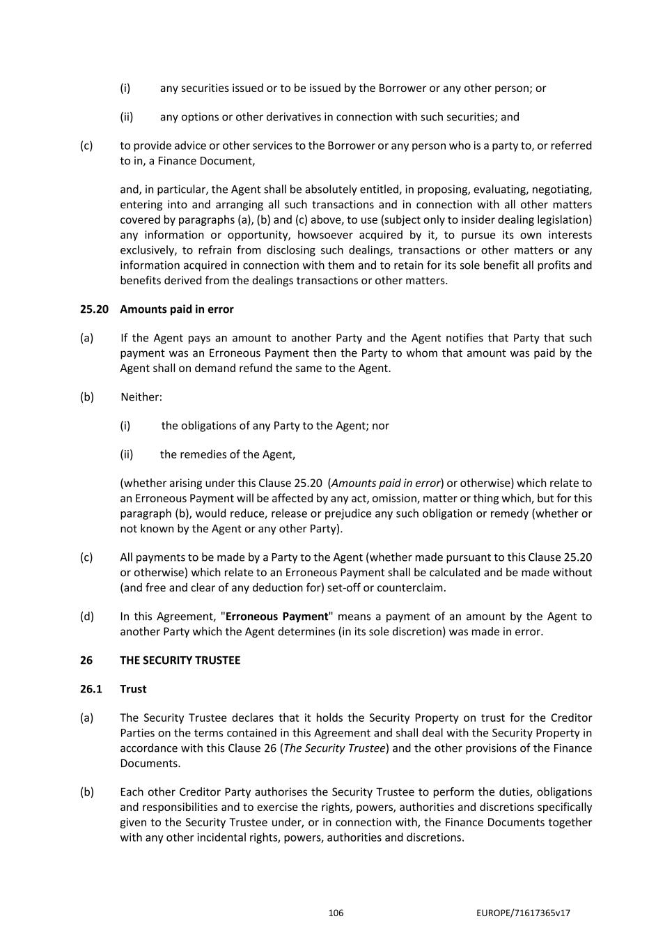 106 EUROPE/71617365v17 (i) any securities issued or to be issued by the Borrower or any other person; or (ii) any options or other derivatives in connection with such securities; and (c) to provide advice or other services to the Borrower or any person who is a party to, or referred to in, a Finance Document, and, in particular, the Agent shall be absolutely entitled, in proposing, evaluating, negotiating, entering into and arranging all such transactions and in connection with all other matters covered by paragraphs (a), (b) and (c) above, to use (subject only to insider dealing legislation) any information or opportunity, howsoever acquired by it, to pursue its own interests exclusively, to refrain from disclosing such dealings, transactions or other matters or any information acquired in connection with them and to retain for its sole benefit all profits and benefits derived from the dealings transactions or other matters. 25.20 Amounts paid in error (a) If the Agent pays an amount to another Party and the Agent notifies that Party that such payment was an Erroneous Payment then the Party to whom that amount was paid by the Agent shall on demand refund the same to the Agent. (b) Neither: (i) the obligations of any Party to the Agent; nor (ii) the remedies of the Agent, (whether arising under this Clause 25.20 (Amounts paid in error) or otherwise) which relate to an Erroneous Payment will be affected by any act, omission, matter or thing which, but for this paragraph (b), would reduce, release or prejudice any such obligation or remedy (whether or not known by the Agent or any other Party). (c) All payments to be made by a Party to the Agent (whether made pursuant to this Clause 25.20 or otherwise) which relate to an Erroneous Payment shall be calculated and be made without (and free and clear of any deduction for) set-off or counterclaim. (d) In this Agreement, "Erroneous Payment" means a payment of an amount by the Agent to another Party which the Agent determines (in its sole discretion) was made in error. 26 THE SECURITY TRUSTEE 26.1 Trust (a) The Security Trustee declares that it holds the Security Property on trust for the Creditor Parties on the terms contained in this Agreement and shall deal with the Security Property in accordance with this Clause 26 (The Security Trustee) and the other provisions of the Finance Documents. (b) Each other Creditor Party authorises the Security Trustee to perform the duties, obligations and responsibilities and to exercise the rights, powers, authorities and discretions specifically given to the Security Trustee under, or in connection with, the Finance Documents together with any other incidental rights, powers, authorities and discretions.