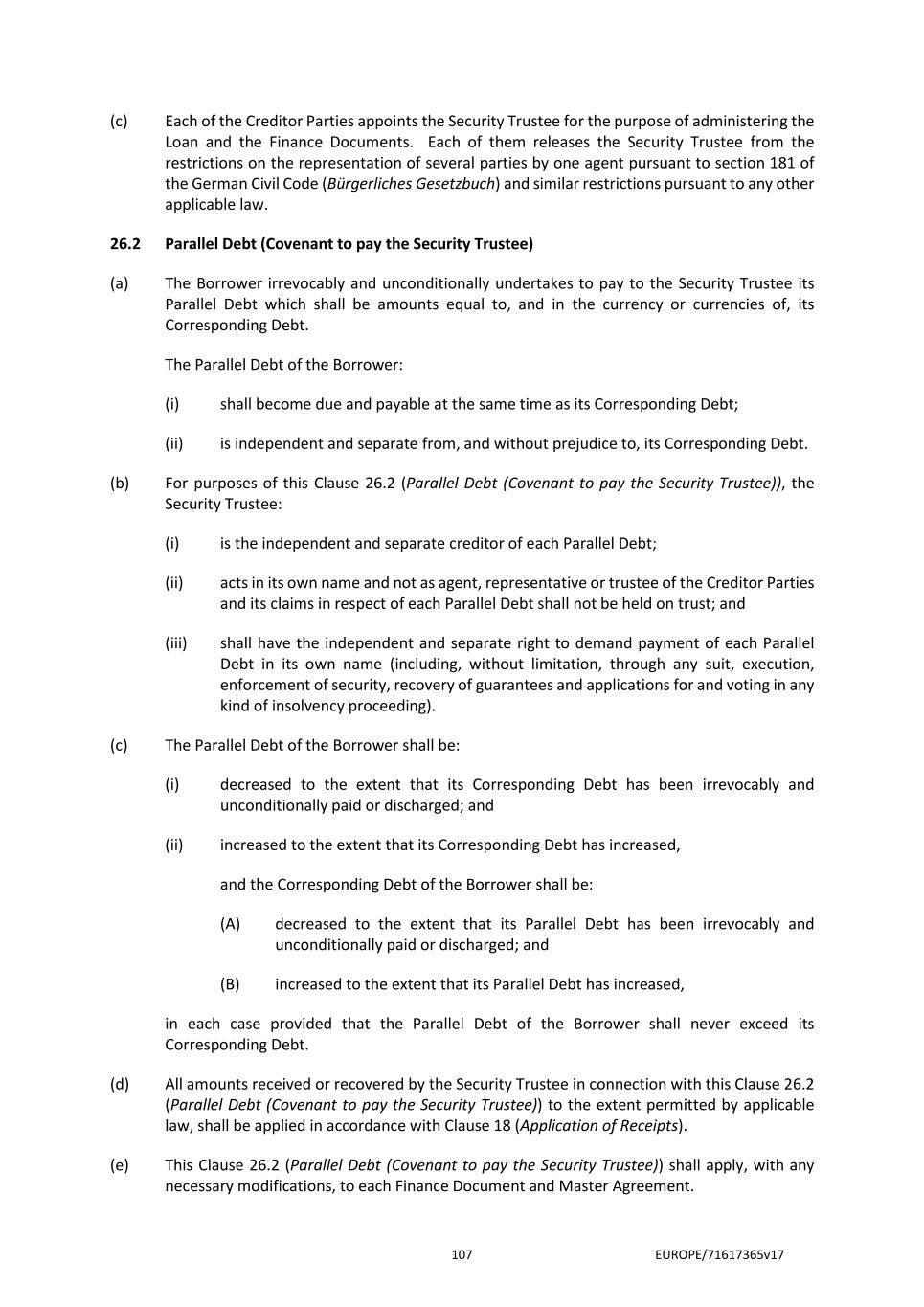 107 EUROPE/71617365v17 (c) Each of the Creditor Parties appoints the Security Trustee for the purpose of administering the Loan and the Finance Documents. Each of them releases the Security Trustee from the restrictions on the representation of several parties by one agent pursuant to section 181 of the German Civil Code (Bürgerliches Gesetzbuch) and similar restrictions pursuant to any other applicable law. 26.2 Parallel Debt (Covenant to pay the Security Trustee) (a) The Borrower irrevocably and unconditionally undertakes to pay to the Security Trustee its Parallel Debt which shall be amounts equal to, and in the currency or currencies of, its Corresponding Debt. The Parallel Debt of the Borrower: (i) shall become due and payable at the same time as its Corresponding Debt; (ii) is independent and separate from, and without prejudice to, its Corresponding Debt. (b) For purposes of this Clause 26.2 (Parallel Debt (Covenant to pay the Security Trustee)), the Security Trustee: (i) is the independent and separate creditor of each Parallel Debt; (ii) acts in its own name and not as agent, representative or trustee of the Creditor Parties and its claims in respect of each Parallel Debt shall not be held on trust; and (iii) shall have the independent and separate right to demand payment of each Parallel Debt in its own name (including, without limitation, through any suit, execution, enforcement of security, recovery of guarantees and applications for and voting in any kind of insolvency proceeding). (c) The Parallel Debt of the Borrower shall be: (i) decreased to the extent that its Corresponding Debt has been irrevocably and unconditionally paid or discharged; and (ii) increased to the extent that its Corresponding Debt has increased, and the Corresponding Debt of the Borrower shall be: (A) decreased to the extent that its Parallel Debt has been irrevocably and unconditionally paid or discharged; and (B) increased to the extent that its Parallel Debt has increased, in each case provided that the Parallel Debt of the Borrower shall never exceed its Corresponding Debt. (d) All amounts received or recovered by the Security Trustee in connection with this Clause 26.2 (Parallel Debt (Covenant to pay the Security Trustee)) to the extent permitted by applicable law, shall be applied in accordance with Clause 18 (Application of Receipts). (e) This Clause 26.2 (Parallel Debt (Covenant to pay the Security Trustee)) shall apply, with any necessary modifications, to each Finance Document and Master Agreement.