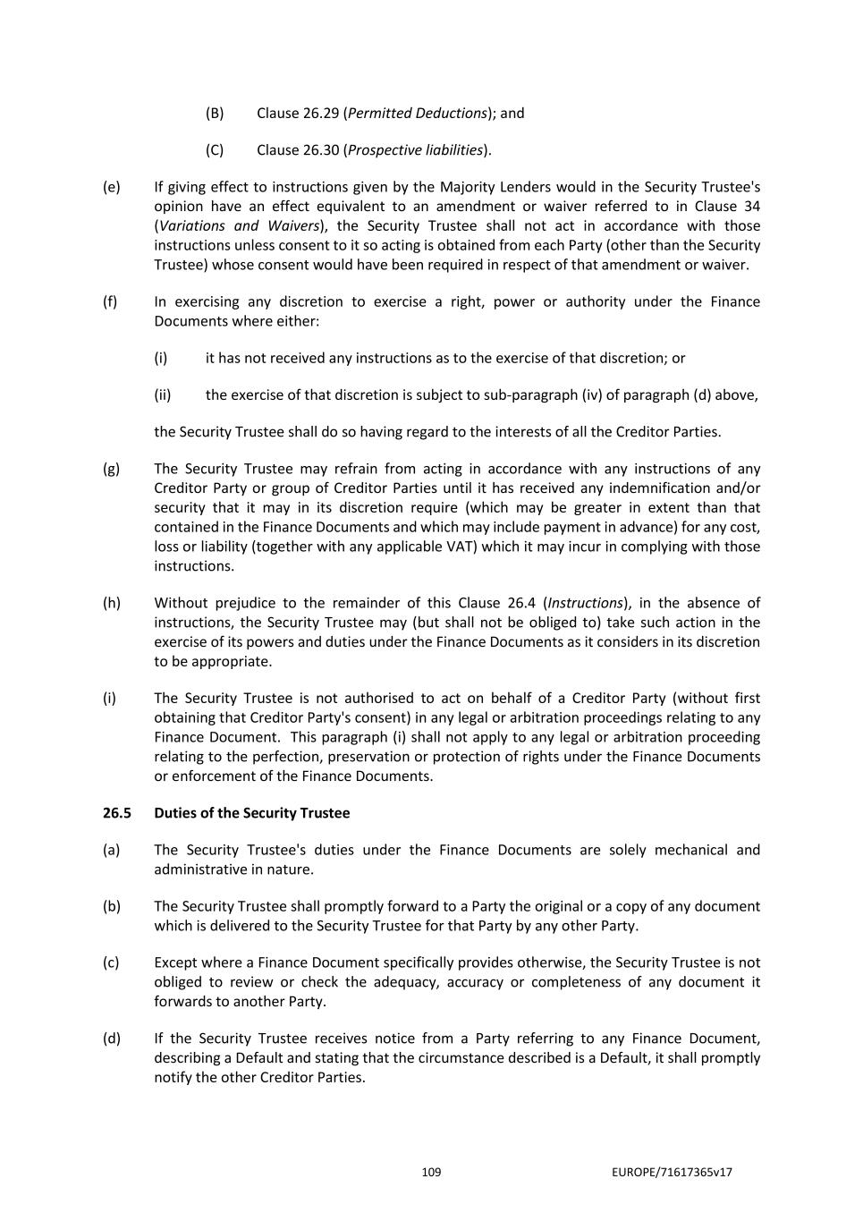 109 EUROPE/71617365v17 (B) Clause 26.29 (Permitted Deductions); and (C) Clause 26.30 (Prospective liabilities). (e) If giving effect to instructions given by the Majority Lenders would in the Security Trustee's opinion have an effect equivalent to an amendment or waiver referred to in Clause 34 (Variations and Waivers), the Security Trustee shall not act in accordance with those instructions unless consent to it so acting is obtained from each Party (other than the Security Trustee) whose consent would have been required in respect of that amendment or waiver. (f) In exercising any discretion to exercise a right, power or authority under the Finance Documents where either: (i) it has not received any instructions as to the exercise of that discretion; or (ii) the exercise of that discretion is subject to sub-paragraph (iv) of paragraph (d) above, the Security Trustee shall do so having regard to the interests of all the Creditor Parties. (g) The Security Trustee may refrain from acting in accordance with any instructions of any Creditor Party or group of Creditor Parties until it has received any indemnification and/or security that it may in its discretion require (which may be greater in extent than that contained in the Finance Documents and which may include payment in advance) for any cost, loss or liability (together with any applicable VAT) which it may incur in complying with those instructions. (h) Without prejudice to the remainder of this Clause 26.4 (Instructions), in the absence of instructions, the Security Trustee may (but shall not be obliged to) take such action in the exercise of its powers and duties under the Finance Documents as it considers in its discretion to be appropriate. (i) The Security Trustee is not authorised to act on behalf of a Creditor Party (without first obtaining that Creditor Party's consent) in any legal or arbitration proceedings relating to any Finance Document. This paragraph (i) shall not apply to any legal or arbitration proceeding relating to the perfection, preservation or protection of rights under the Finance Documents or enforcement of the Finance Documents. 26.5 Duties of the Security Trustee (a) The Security Trustee's duties under the Finance Documents are solely mechanical and administrative in nature. (b) The Security Trustee shall promptly forward to a Party the original or a copy of any document which is delivered to the Security Trustee for that Party by any other Party. (c) Except where a Finance Document specifically provides otherwise, the Security Trustee is not obliged to review or check the adequacy, accuracy or completeness of any document it forwards to another Party. (d) If the Security Trustee receives notice from a Party referring to any Finance Document, describing a Default and stating that the circumstance described is a Default, it shall promptly notify the other Creditor Parties.