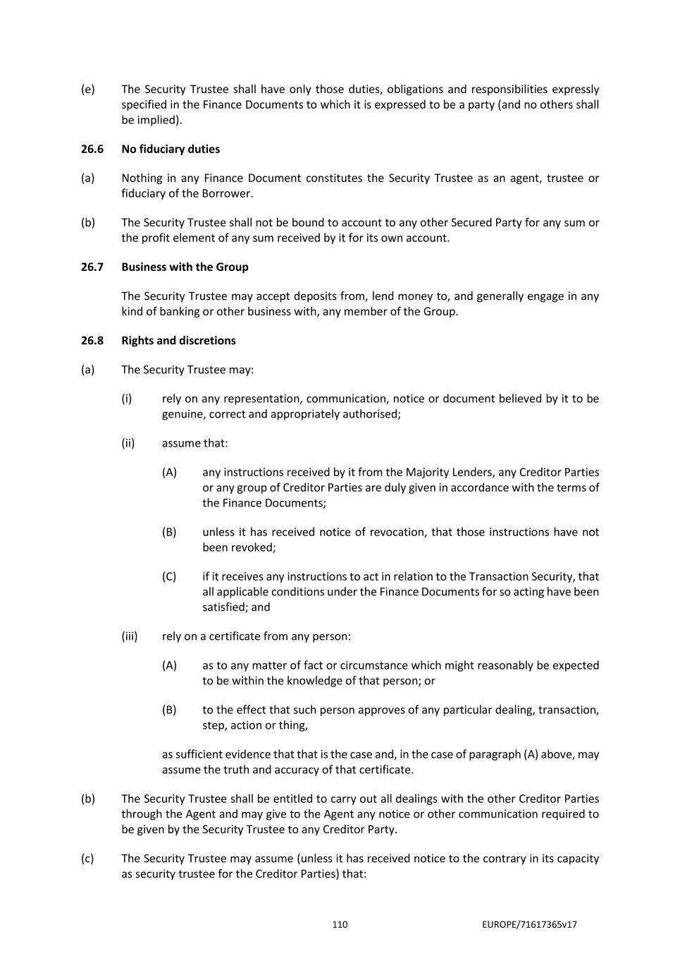 110 EUROPE/71617365v17 (e) The Security Trustee shall have only those duties, obligations and responsibilities expressly specified in the Finance Documents to which it is expressed to be a party (and no others shall be implied). 26.6 No fiduciary duties (a) Nothing in any Finance Document constitutes the Security Trustee as an agent, trustee or fiduciary of the Borrower. (b) The Security Trustee shall not be bound to account to any other Secured Party for any sum or the profit element of any sum received by it for its own account. 26.7 Business with the Group The Security Trustee may accept deposits from, lend money to, and generally engage in any kind of banking or other business with, any member of the Group. 26.8 Rights and discretions (a) The Security Trustee may: (i) rely on any representation, communication, notice or document believed by it to be genuine, correct and appropriately authorised; (ii) assume that: (A) any instructions received by it from the Majority Lenders, any Creditor Parties or any group of Creditor Parties are duly given in accordance with the terms of the Finance Documents; (B) unless it has received notice of revocation, that those instructions have not been revoked; (C) if it receives any instructions to act in relation to the Transaction Security, that all applicable conditions under the Finance Documents for so acting have been satisfied; and (iii) rely on a certificate from any person: (A) as to any matter of fact or circumstance which might reasonably be expected to be within the knowledge of that person; or (B) to the effect that such person approves of any particular dealing, transaction, step, action or thing, as sufficient evidence that that is the case and, in the case of paragraph (A) above, may assume the truth and accuracy of that certificate. (b) The Security Trustee shall be entitled to carry out all dealings with the other Creditor Parties through the Agent and may give to the Agent any notice or other communication required to be given by the Security Trustee to any Creditor Party. (c) The Security Trustee may assume (unless it has received notice to the contrary in its capacity as security trustee for the Creditor Parties) that: