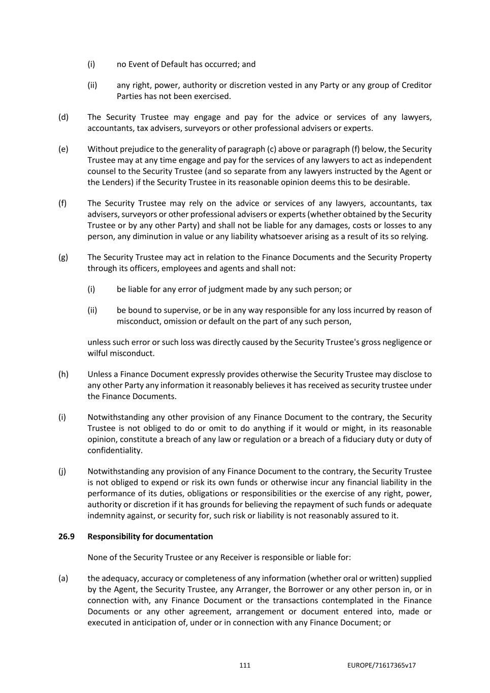 111 EUROPE/71617365v17 (i) no Event of Default has occurred; and (ii) any right, power, authority or discretion vested in any Party or any group of Creditor Parties has not been exercised. (d) The Security Trustee may engage and pay for the advice or services of any lawyers, accountants, tax advisers, surveyors or other professional advisers or experts. (e) Without prejudice to the generality of paragraph (c) above or paragraph (f) below, the Security Trustee may at any time engage and pay for the services of any lawyers to act as independent counsel to the Security Trustee (and so separate from any lawyers instructed by the Agent or the Lenders) if the Security Trustee in its reasonable opinion deems this to be desirable. (f) The Security Trustee may rely on the advice or services of any lawyers, accountants, tax advisers, surveyors or other professional advisers or experts (whether obtained by the Security Trustee or by any other Party) and shall not be liable for any damages, costs or losses to any person, any diminution in value or any liability whatsoever arising as a result of its so relying. (g) The Security Trustee may act in relation to the Finance Documents and the Security Property through its officers, employees and agents and shall not: (i) be liable for any error of judgment made by any such person; or (ii) be bound to supervise, or be in any way responsible for any loss incurred by reason of misconduct, omission or default on the part of any such person, unless such error or such loss was directly caused by the Security Trustee's gross negligence or wilful misconduct. (h) Unless a Finance Document expressly provides otherwise the Security Trustee may disclose to any other Party any information it reasonably believes it has received as security trustee under the Finance Documents. (i) Notwithstanding any other provision of any Finance Document to the contrary, the Security Trustee is not obliged to do or omit to do anything if it would or might, in its reasonable opinion, constitute a breach of any law or regulation or a breach of a fiduciary duty or duty of confidentiality. (j) Notwithstanding any provision of any Finance Document to the contrary, the Security Trustee is not obliged to expend or risk its own funds or otherwise incur any financial liability in the performance of its duties, obligations or responsibilities or the exercise of any right, power, authority or discretion if it has grounds for believing the repayment of such funds or adequate indemnity against, or security for, such risk or liability is not reasonably assured to it. 26.9 Responsibility for documentation None of the Security Trustee or any Receiver is responsible or liable for: (a) the adequacy, accuracy or completeness of any information (whether oral or written) supplied by the Agent, the Security Trustee, any Arranger, the Borrower or any other person in, or in connection with, any Finance Document or the transactions contemplated in the Finance Documents or any other agreement, arrangement or document entered into, made or executed in anticipation of, under or in connection with any Finance Document; or