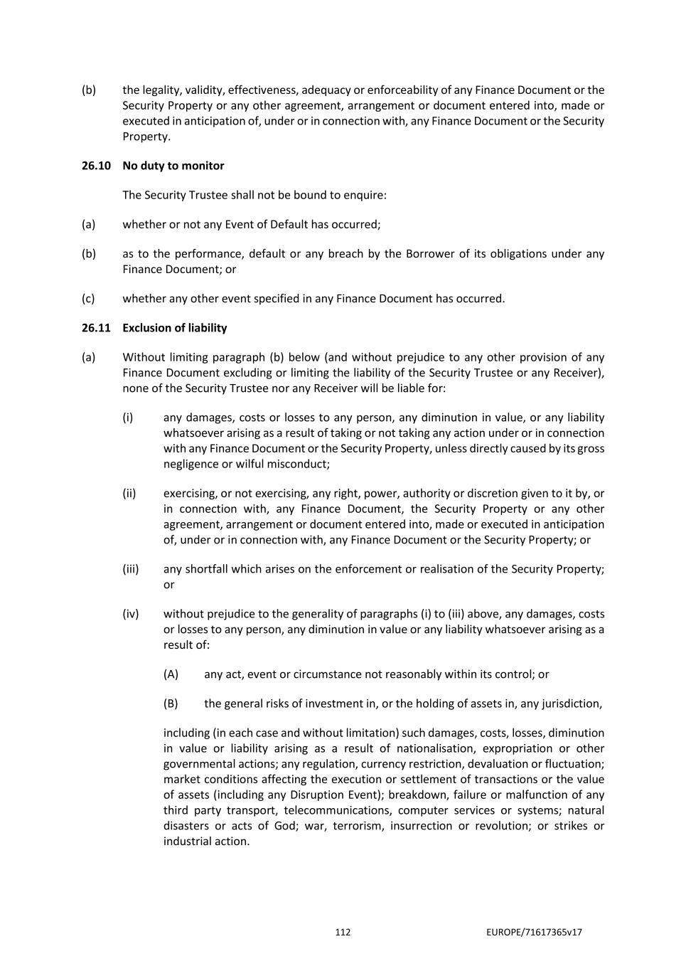 112 EUROPE/71617365v17 (b) the legality, validity, effectiveness, adequacy or enforceability of any Finance Document or the Security Property or any other agreement, arrangement or document entered into, made or executed in anticipation of, under or in connection with, any Finance Document or the Security Property. 26.10 No duty to monitor The Security Trustee shall not be bound to enquire: (a) whether or not any Event of Default has occurred; (b) as to the performance, default or any breach by the Borrower of its obligations under any Finance Document; or (c) whether any other event specified in any Finance Document has occurred. 26.11 Exclusion of liability (a) Without limiting paragraph (b) below (and without prejudice to any other provision of any Finance Document excluding or limiting the liability of the Security Trustee or any Receiver), none of the Security Trustee nor any Receiver will be liable for: (i) any damages, costs or losses to any person, any diminution in value, or any liability whatsoever arising as a result of taking or not taking any action under or in connection with any Finance Document or the Security Property, unless directly caused by its gross negligence or wilful misconduct; (ii) exercising, or not exercising, any right, power, authority or discretion given to it by, or in connection with, any Finance Document, the Security Property or any other agreement, arrangement or document entered into, made or executed in anticipation of, under or in connection with, any Finance Document or the Security Property; or (iii) any shortfall which arises on the enforcement or realisation of the Security Property; or (iv) without prejudice to the generality of paragraphs (i) to (iii) above, any damages, costs or losses to any person, any diminution in value or any liability whatsoever arising as a result of: (A) any act, event or circumstance not reasonably within its control; or (B) the general risks of investment in, or the holding of assets in, any jurisdiction, including (in each case and without limitation) such damages, costs, losses, diminution in value or liability arising as a result of nationalisation, expropriation or other governmental actions; any regulation, currency restriction, devaluation or fluctuation; market conditions affecting the execution or settlement of transactions or the value of assets (including any Disruption Event); breakdown, failure or malfunction of any third party transport, telecommunications, computer services or systems; natural disasters or acts of God; war, terrorism, insurrection or revolution; or strikes or industrial action.