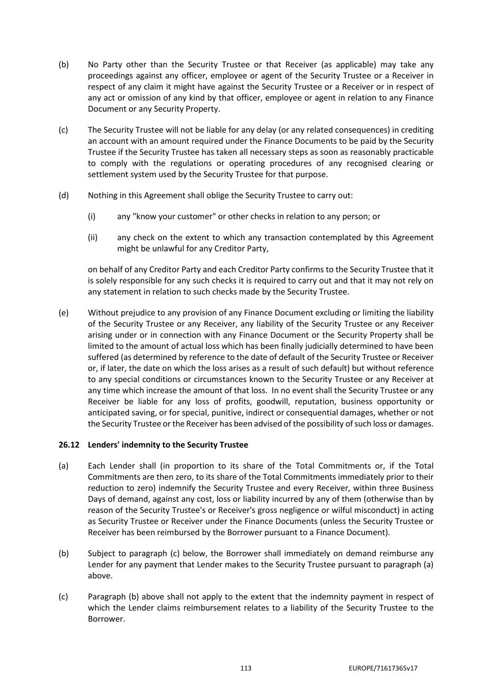 113 EUROPE/71617365v17 (b) No Party other than the Security Trustee or that Receiver (as applicable) may take any proceedings against any officer, employee or agent of the Security Trustee or a Receiver in respect of any claim it might have against the Security Trustee or a Receiver or in respect of any act or omission of any kind by that officer, employee or agent in relation to any Finance Document or any Security Property. (c) The Security Trustee will not be liable for any delay (or any related consequences) in crediting an account with an amount required under the Finance Documents to be paid by the Security Trustee if the Security Trustee has taken all necessary steps as soon as reasonably practicable to comply with the regulations or operating procedures of any recognised clearing or settlement system used by the Security Trustee for that purpose. (d) Nothing in this Agreement shall oblige the Security Trustee to carry out: (i) any "know your customer" or other checks in relation to any person; or (ii) any check on the extent to which any transaction contemplated by this Agreement might be unlawful for any Creditor Party, on behalf of any Creditor Party and each Creditor Party confirms to the Security Trustee that it is solely responsible for any such checks it is required to carry out and that it may not rely on any statement in relation to such checks made by the Security Trustee. (e) Without prejudice to any provision of any Finance Document excluding or limiting the liability of the Security Trustee or any Receiver, any liability of the Security Trustee or any Receiver arising under or in connection with any Finance Document or the Security Property shall be limited to the amount of actual loss which has been finally judicially determined to have been suffered (as determined by reference to the date of default of the Security Trustee or Receiver or, if later, the date on which the loss arises as a result of such default) but without reference to any special conditions or circumstances known to the Security Trustee or any Receiver at any time which increase the amount of that loss. In no event shall the Security Trustee or any Receiver be liable for any loss of profits, goodwill, reputation, business opportunity or anticipated saving, or for special, punitive, indirect or consequential damages, whether or not the Security Trustee or the Receiver has been advised of the possibility of such loss or damages. 26.12 Lenders' indemnity to the Security Trustee (a) Each Lender shall (in proportion to its share of the Total Commitments or, if the Total Commitments are then zero, to its share of the Total Commitments immediately prior to their reduction to zero) indemnify the Security Trustee and every Receiver, within three Business Days of demand, against any cost, loss or liability incurred by any of them (otherwise than by reason of the Security Trustee's or Receiver's gross negligence or wilful misconduct) in acting as Security Trustee or Receiver under the Finance Documents (unless the Security Trustee or Receiver has been reimbursed by the Borrower pursuant to a Finance Document). (b) Subject to paragraph (c) below, the Borrower shall immediately on demand reimburse any Lender for any payment that Lender makes to the Security Trustee pursuant to paragraph (a) above. (c) Paragraph (b) above shall not apply to the extent that the indemnity payment in respect of which the Lender claims reimbursement relates to a liability of the Security Trustee to the Borrower.