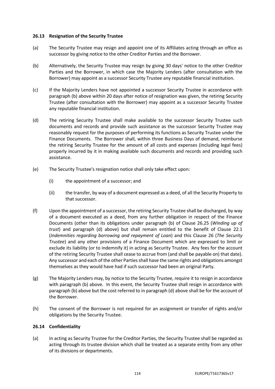 114 EUROPE/71617365v17 26.13 Resignation of the Security Trustee (a) The Security Trustee may resign and appoint one of its Affiliates acting through an office as successor by giving notice to the other Creditor Parties and the Borrower. (b) Alternatively, the Security Trustee may resign by giving 30 days' notice to the other Creditor Parties and the Borrower, in which case the Majority Lenders (after consultation with the Borrower) may appoint as a successor Security Trustee any reputable financial institution. (c) If the Majority Lenders have not appointed a successor Security Trustee in accordance with paragraph (b) above within 20 days after notice of resignation was given, the retiring Security Trustee (after consultation with the Borrower) may appoint as a successor Security Trustee any reputable financial institution. (d) The retiring Security Trustee shall make available to the successor Security Trustee such documents and records and provide such assistance as the successor Security Trustee may reasonably request for the purposes of performing its functions as Security Trustee under the Finance Documents. The Borrower shall, within three Business Days of demand, reimburse the retiring Security Trustee for the amount of all costs and expenses (including legal fees) properly incurred by it in making available such documents and records and providing such assistance. (e) The Security Trustee's resignation notice shall only take effect upon: (i) the appointment of a successor; and (ii) the transfer, by way of a document expressed as a deed, of all the Security Property to that successor. (f) Upon the appointment of a successor, the retiring Security Trustee shall be discharged, by way of a document executed as a deed, from any further obligation in respect of the Finance Documents (other than its obligations under paragraph (b) of Clause 26.25 (Winding up of trust) and paragraph (d) above) but shall remain entitled to the benefit of Clause 22.1 (Indemnities regarding borrowing and repayment of Loan) and this Clause 26 (The Security Trustee) and any other provisions of a Finance Document which are expressed to limit or exclude its liability (or to indemnify it) in acting as Security Trustee. Any fees for the account of the retiring Security Trustee shall cease to accrue from (and shall be payable on) that date). Any successor and each of the other Parties shall have the same rights and obligations amongst themselves as they would have had if such successor had been an original Party. (g) The Majority Lenders may, by notice to the Security Trustee, require it to resign in accordance with paragraph (b) above. In this event, the Security Trustee shall resign in accordance with paragraph (b) above but the cost referred to in paragraph (d) above shall be for the account of the Borrower. (h) The consent of the Borrower is not required for an assignment or transfer of rights and/or obligations by the Security Trustee. 26.14 Confidentiality (a) In acting as Security Trustee for the Creditor Parties, the Security Trustee shall be regarded as acting through its trustee division which shall be treated as a separate entity from any other of its divisions or departments.