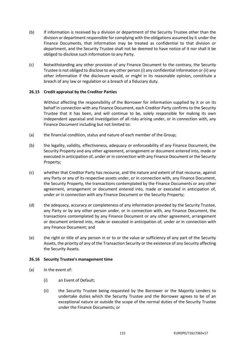 115 EUROPE/71617365v17 (b) If information is received by a division or department of the Security Trustee other than the division or department responsible for complying with the obligations assumed by it under the Finance Documents, that information may be treated as confidential to that division or department, and the Security Trustee shall not be deemed to have notice of it nor shall it be obliged to disclose such information to any Party. (c) Notwithstanding any other provision of any Finance Document to the contrary, the Security Trustee is not obliged to disclose to any other person (i) any confidential information or (ii) any other information if the disclosure would, or might in its reasonable opinion, constitute a breach of any law or regulation or a breach of a fiduciary duty. 26.15 Credit appraisal by the Creditor Parties Without affecting the responsibility of the Borrower for information supplied by it or on its behalf in connection with any Finance Document, each Creditor Party confirms to the Security Trustee that it has been, and will continue to be, solely responsible for making its own independent appraisal and investigation of all risks arising under, or in connection with, any Finance Document including but not limited to: (a) the financial condition, status and nature of each member of the Group; (b) the legality, validity, effectiveness, adequacy or enforceability of any Finance Document, the Security Property and any other agreement, arrangement or document entered into, made or executed in anticipation of, under or in connection with any Finance Document or the Security Property; (c) whether that Creditor Party has recourse, and the nature and extent of that recourse, against any Party or any of its respective assets under, or in connection with, any Finance Document, the Security Property, the transactions contemplated by the Finance Documents or any other agreement, arrangement or document entered into, made or executed in anticipation of, under or in connection with any Finance Document or the Security Property; (d) the adequacy, accuracy or completeness of any information provided by the Security Trustee, any Party or by any other person under, or in connection with, any Finance Document, the transactions contemplated by any Finance Document or any other agreement, arrangement or document entered into, made or executed in anticipation of, under or in connection with any Finance Document; and (e) the right or title of any person in or to or the value or sufficiency of any part of the Security Assets, the priority of any of the Transaction Security or the existence of any Security affecting the Security Assets. 26.16 Security Trustee's management time (a) In the event of: (i) an Event of Default; (ii) the Security Trustee being requested by the Borrower or the Majority Lenders to undertake duties which the Security Trustee and the Borrower agrees to be of an exceptional nature or outside the scope of the normal duties of the Security Trustee under the Finance Documents; or