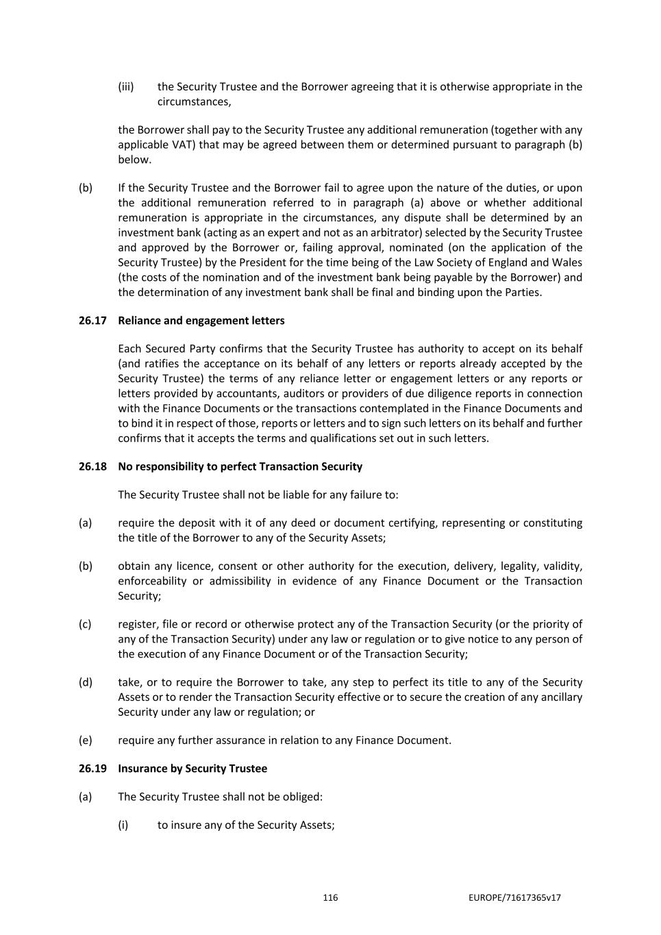116 EUROPE/71617365v17 (iii) the Security Trustee and the Borrower agreeing that it is otherwise appropriate in the circumstances, the Borrower shall pay to the Security Trustee any additional remuneration (together with any applicable VAT) that may be agreed between them or determined pursuant to paragraph (b) below. (b) If the Security Trustee and the Borrower fail to agree upon the nature of the duties, or upon the additional remuneration referred to in paragraph (a) above or whether additional remuneration is appropriate in the circumstances, any dispute shall be determined by an investment bank (acting as an expert and not as an arbitrator) selected by the Security Trustee and approved by the Borrower or, failing approval, nominated (on the application of the Security Trustee) by the President for the time being of the Law Society of England and Wales (the costs of the nomination and of the investment bank being payable by the Borrower) and the determination of any investment bank shall be final and binding upon the Parties. 26.17 Reliance and engagement letters Each Secured Party confirms that the Security Trustee has authority to accept on its behalf (and ratifies the acceptance on its behalf of any letters or reports already accepted by the Security Trustee) the terms of any reliance letter or engagement letters or any reports or letters provided by accountants, auditors or providers of due diligence reports in connection with the Finance Documents or the transactions contemplated in the Finance Documents and to bind it in respect of those, reports or letters and to sign such letters on its behalf and further confirms that it accepts the terms and qualifications set out in such letters. 26.18 No responsibility to perfect Transaction Security The Security Trustee shall not be liable for any failure to: (a) require the deposit with it of any deed or document certifying, representing or constituting the title of the Borrower to any of the Security Assets; (b) obtain any licence, consent or other authority for the execution, delivery, legality, validity, enforceability or admissibility in evidence of any Finance Document or the Transaction Security; (c) register, file or record or otherwise protect any of the Transaction Security (or the priority of any of the Transaction Security) under any law or regulation or to give notice to any person of the execution of any Finance Document or of the Transaction Security; (d) take, or to require the Borrower to take, any step to perfect its title to any of the Security Assets or to render the Transaction Security effective or to secure the creation of any ancillary Security under any law or regulation; or (e) require any further assurance in relation to any Finance Document. 26.19 Insurance by Security Trustee (a) The Security Trustee shall not be obliged: (i) to insure any of the Security Assets;