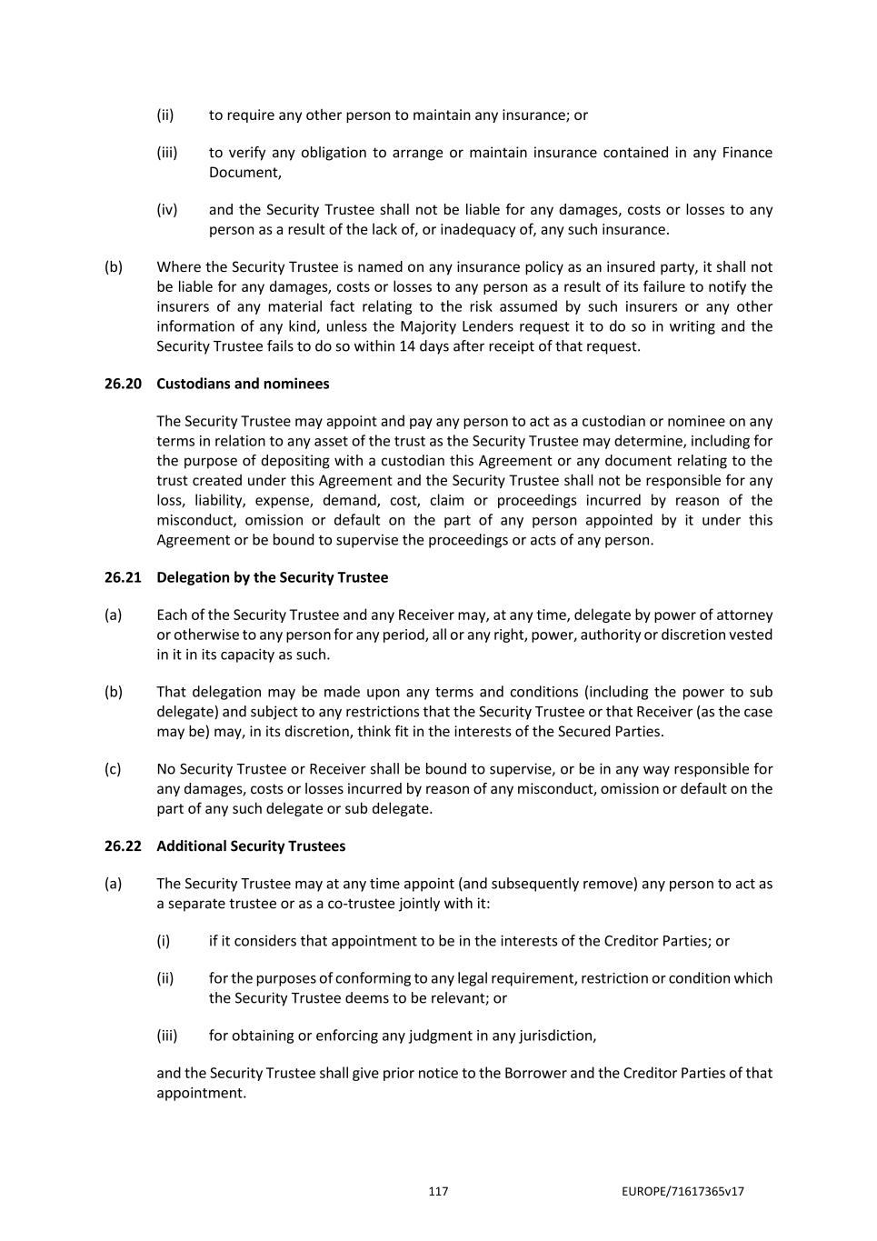 117 EUROPE/71617365v17 (ii) to require any other person to maintain any insurance; or (iii) to verify any obligation to arrange or maintain insurance contained in any Finance Document, (iv) and the Security Trustee shall not be liable for any damages, costs or losses to any person as a result of the lack of, or inadequacy of, any such insurance. (b) Where the Security Trustee is named on any insurance policy as an insured party, it shall not be liable for any damages, costs or losses to any person as a result of its failure to notify the insurers of any material fact relating to the risk assumed by such insurers or any other information of any kind, unless the Majority Lenders request it to do so in writing and the Security Trustee fails to do so within 14 days after receipt of that request. 26.20 Custodians and nominees The Security Trustee may appoint and pay any person to act as a custodian or nominee on any terms in relation to any asset of the trust as the Security Trustee may determine, including for the purpose of depositing with a custodian this Agreement or any document relating to the trust created under this Agreement and the Security Trustee shall not be responsible for any loss, liability, expense, demand, cost, claim or proceedings incurred by reason of the misconduct, omission or default on the part of any person appointed by it under this Agreement or be bound to supervise the proceedings or acts of any person. 26.21 Delegation by the Security Trustee (a) Each of the Security Trustee and any Receiver may, at any time, delegate by power of attorney or otherwise to any person for any period, all or any right, power, authority or discretion vested in it in its capacity as such. (b) That delegation may be made upon any terms and conditions (including the power to sub delegate) and subject to any restrictions that the Security Trustee or that Receiver (as the case may be) may, in its discretion, think fit in the interests of the Secured Parties. (c) No Security Trustee or Receiver shall be bound to supervise, or be in any way responsible for any damages, costs or losses incurred by reason of any misconduct, omission or default on the part of any such delegate or sub delegate. 26.22 Additional Security Trustees (a) The Security Trustee may at any time appoint (and subsequently remove) any person to act as a separate trustee or as a co-trustee jointly with it: (i) if it considers that appointment to be in the interests of the Creditor Parties; or (ii) for the purposes of conforming to any legal requirement, restriction or condition which the Security Trustee deems to be relevant; or (iii) for obtaining or enforcing any judgment in any jurisdiction, and the Security Trustee shall give prior notice to the Borrower and the Creditor Parties of that appointment.