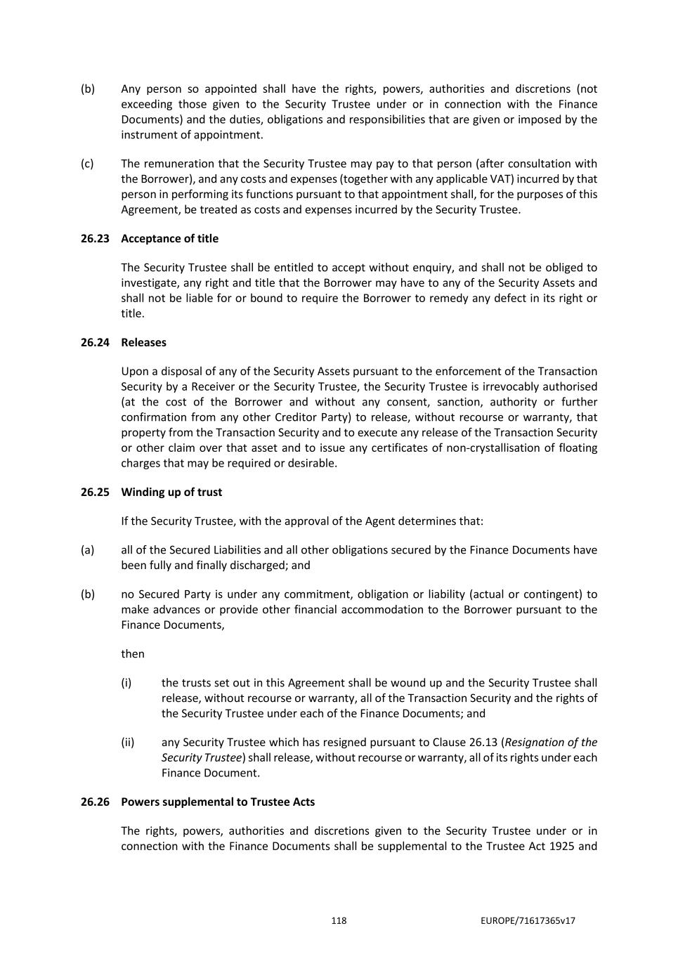 118 EUROPE/71617365v17 (b) Any person so appointed shall have the rights, powers, authorities and discretions (not exceeding those given to the Security Trustee under or in connection with the Finance Documents) and the duties, obligations and responsibilities that are given or imposed by the instrument of appointment. (c) The remuneration that the Security Trustee may pay to that person (after consultation with the Borrower), and any costs and expenses (together with any applicable VAT) incurred by that person in performing its functions pursuant to that appointment shall, for the purposes of this Agreement, be treated as costs and expenses incurred by the Security Trustee. 26.23 Acceptance of title The Security Trustee shall be entitled to accept without enquiry, and shall not be obliged to investigate, any right and title that the Borrower may have to any of the Security Assets and shall not be liable for or bound to require the Borrower to remedy any defect in its right or title. 26.24 Releases Upon a disposal of any of the Security Assets pursuant to the enforcement of the Transaction Security by a Receiver or the Security Trustee, the Security Trustee is irrevocably authorised (at the cost of the Borrower and without any consent, sanction, authority or further confirmation from any other Creditor Party) to release, without recourse or warranty, that property from the Transaction Security and to execute any release of the Transaction Security or other claim over that asset and to issue any certificates of non-crystallisation of floating charges that may be required or desirable. 26.25 Winding up of trust If the Security Trustee, with the approval of the Agent determines that: (a) all of the Secured Liabilities and all other obligations secured by the Finance Documents have been fully and finally discharged; and (b) no Secured Party is under any commitment, obligation or liability (actual or contingent) to make advances or provide other financial accommodation to the Borrower pursuant to the Finance Documents, then (i) the trusts set out in this Agreement shall be wound up and the Security Trustee shall release, without recourse or warranty, all of the Transaction Security and the rights of the Security Trustee under each of the Finance Documents; and (ii) any Security Trustee which has resigned pursuant to Clause 26.13 (Resignation of the Security Trustee) shall release, without recourse or warranty, all of its rights under each Finance Document. 26.26 Powers supplemental to Trustee Acts The rights, powers, authorities and discretions given to the Security Trustee under or in connection with the Finance Documents shall be supplemental to the Trustee Act 1925 and