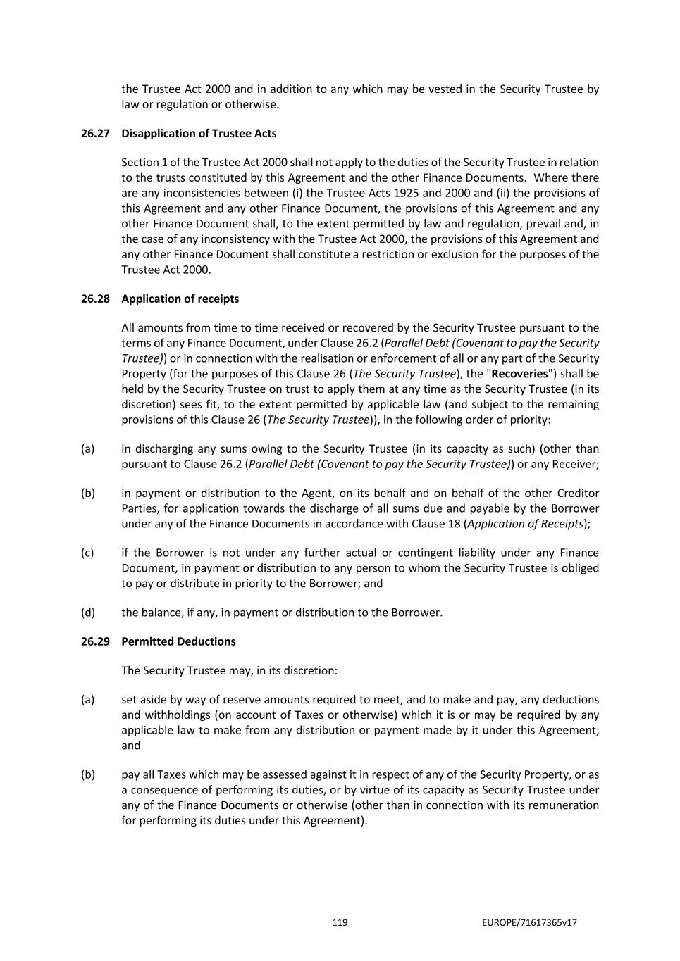 119 EUROPE/71617365v17 the Trustee Act 2000 and in addition to any which may be vested in the Security Trustee by law or regulation or otherwise. 26.27 Disapplication of Trustee Acts Section 1 of the Trustee Act 2000 shall not apply to the duties of the Security Trustee in relation to the trusts constituted by this Agreement and the other Finance Documents. Where there are any inconsistencies between (i) the Trustee Acts 1925 and 2000 and (ii) the provisions of this Agreement and any other Finance Document, the provisions of this Agreement and any other Finance Document shall, to the extent permitted by law and regulation, prevail and, in the case of any inconsistency with the Trustee Act 2000, the provisions of this Agreement and any other Finance Document shall constitute a restriction or exclusion for the purposes of the Trustee Act 2000. 26.28 Application of receipts All amounts from time to time received or recovered by the Security Trustee pursuant to the terms of any Finance Document, under Clause 26.2 (Parallel Debt (Covenant to pay the Security Trustee)) or in connection with the realisation or enforcement of all or any part of the Security Property (for the purposes of this Clause 26 (The Security Trustee), the "Recoveries") shall be held by the Security Trustee on trust to apply them at any time as the Security Trustee (in its discretion) sees fit, to the extent permitted by applicable law (and subject to the remaining provisions of this Clause 26 (The Security Trustee)), in the following order of priority: (a) in discharging any sums owing to the Security Trustee (in its capacity as such) (other than pursuant to Clause 26.2 (Parallel Debt (Covenant to pay the Security Trustee)) or any Receiver; (b) in payment or distribution to the Agent, on its behalf and on behalf of the other Creditor Parties, for application towards the discharge of all sums due and payable by the Borrower under any of the Finance Documents in accordance with Clause 18 (Application of Receipts); (c) if the Borrower is not under any further actual or contingent liability under any Finance Document, in payment or distribution to any person to whom the Security Trustee is obliged to pay or distribute in priority to the Borrower; and (d) the balance, if any, in payment or distribution to the Borrower. 26.29 Permitted Deductions The Security Trustee may, in its discretion: (a) set aside by way of reserve amounts required to meet, and to make and pay, any deductions and withholdings (on account of Taxes or otherwise) which it is or may be required by any applicable law to make from any distribution or payment made by it under this Agreement; and (b) pay all Taxes which may be assessed against it in respect of any of the Security Property, or as a consequence of performing its duties, or by virtue of its capacity as Security Trustee under any of the Finance Documents or otherwise (other than in connection with its remuneration for performing its duties under this Agreement).