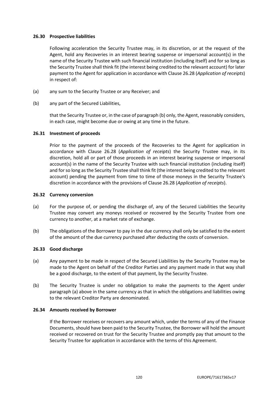 120 EUROPE/71617365v17 26.30 Prospective liabilities Following acceleration the Security Trustee may, in its discretion, or at the request of the Agent, hold any Recoveries in an interest bearing suspense or impersonal account(s) in the name of the Security Trustee with such financial institution (including itself) and for so long as the Security Trustee shall think fit (the interest being credited to the relevant account) for later payment to the Agent for application in accordance with Clause 26.28 (Application of receipts) in respect of: (a) any sum to the Security Trustee or any Receiver; and (b) any part of the Secured Liabilities, that the Security Trustee or, in the case of paragraph (b) only, the Agent, reasonably considers, in each case, might become due or owing at any time in the future. 26.31 Investment of proceeds Prior to the payment of the proceeds of the Recoveries to the Agent for application in accordance with Clause 26.28 (Application of receipts) the Security Trustee may, in its discretion, hold all or part of those proceeds in an interest bearing suspense or impersonal account(s) in the name of the Security Trustee with such financial institution (including itself) and for so long as the Security Trustee shall think fit (the interest being credited to the relevant account) pending the payment from time to time of those moneys in the Security Trustee's discretion in accordance with the provisions of Clause 26.28 (Application of receipts). 26.32 Currency conversion (a) For the purpose of, or pending the discharge of, any of the Secured Liabilities the Security Trustee may convert any moneys received or recovered by the Security Trustee from one currency to another, at a market rate of exchange. (b) The obligations of the Borrower to pay in the due currency shall only be satisfied to the extent of the amount of the due currency purchased after deducting the costs of conversion. 26.33 Good discharge (a) Any payment to be made in respect of the Secured Liabilities by the Security Trustee may be made to the Agent on behalf of the Creditor Parties and any payment made in that way shall be a good discharge, to the extent of that payment, by the Security Trustee. (b) The Security Trustee is under no obligation to make the payments to the Agent under paragraph (a) above in the same currency as that in which the obligations and liabilities owing to the relevant Creditor Party are denominated. 26.34 Amounts received by Borrower If the Borrower receives or recovers any amount which, under the terms of any of the Finance Documents, should have been paid to the Security Trustee, the Borrower will hold the amount received or recovered on trust for the Security Trustee and promptly pay that amount to the Security Trustee for application in accordance with the terms of this Agreement.