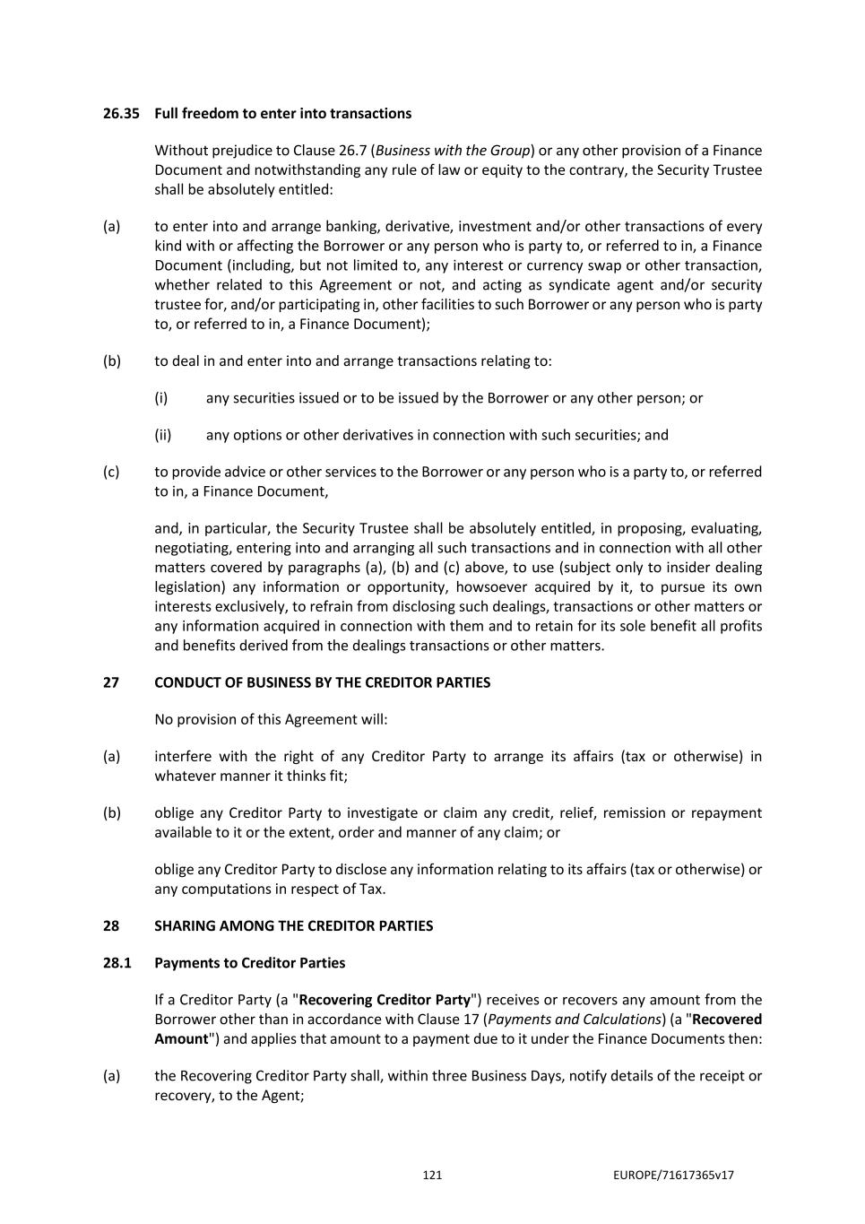 121 EUROPE/71617365v17 26.35 Full freedom to enter into transactions Without prejudice to Clause 26.7 (Business with the Group) or any other provision of a Finance Document and notwithstanding any rule of law or equity to the contrary, the Security Trustee shall be absolutely entitled: (a) to enter into and arrange banking, derivative, investment and/or other transactions of every kind with or affecting the Borrower or any person who is party to, or referred to in, a Finance Document (including, but not limited to, any interest or currency swap or other transaction, whether related to this Agreement or not, and acting as syndicate agent and/or security trustee for, and/or participating in, other facilities to such Borrower or any person who is party to, or referred to in, a Finance Document); (b) to deal in and enter into and arrange transactions relating to: (i) any securities issued or to be issued by the Borrower or any other person; or (ii) any options or other derivatives in connection with such securities; and (c) to provide advice or other services to the Borrower or any person who is a party to, or referred to in, a Finance Document, and, in particular, the Security Trustee shall be absolutely entitled, in proposing, evaluating, negotiating, entering into and arranging all such transactions and in connection with all other matters covered by paragraphs (a), (b) and (c) above, to use (subject only to insider dealing legislation) any information or opportunity, howsoever acquired by it, to pursue its own interests exclusively, to refrain from disclosing such dealings, transactions or other matters or any information acquired in connection with them and to retain for its sole benefit all profits and benefits derived from the dealings transactions or other matters. 27 CONDUCT OF BUSINESS BY THE CREDITOR PARTIES No provision of this Agreement will: (a) interfere with the right of any Creditor Party to arrange its affairs (tax or otherwise) in whatever manner it thinks fit; (b) oblige any Creditor Party to investigate or claim any credit, relief, remission or repayment available to it or the extent, order and manner of any claim; or oblige any Creditor Party to disclose any information relating to its affairs (tax or otherwise) or any computations in respect of Tax. 28 SHARING AMONG THE CREDITOR PARTIES 28.1 Payments to Creditor Parties If a Creditor Party (a "Recovering Creditor Party") receives or recovers any amount from the Borrower other than in accordance with Clause 17 (Payments and Calculations) (a "Recovered Amount") and applies that amount to a payment due to it under the Finance Documents then: (a) the Recovering Creditor Party shall, within three Business Days, notify details of the receipt or recovery, to the Agent;