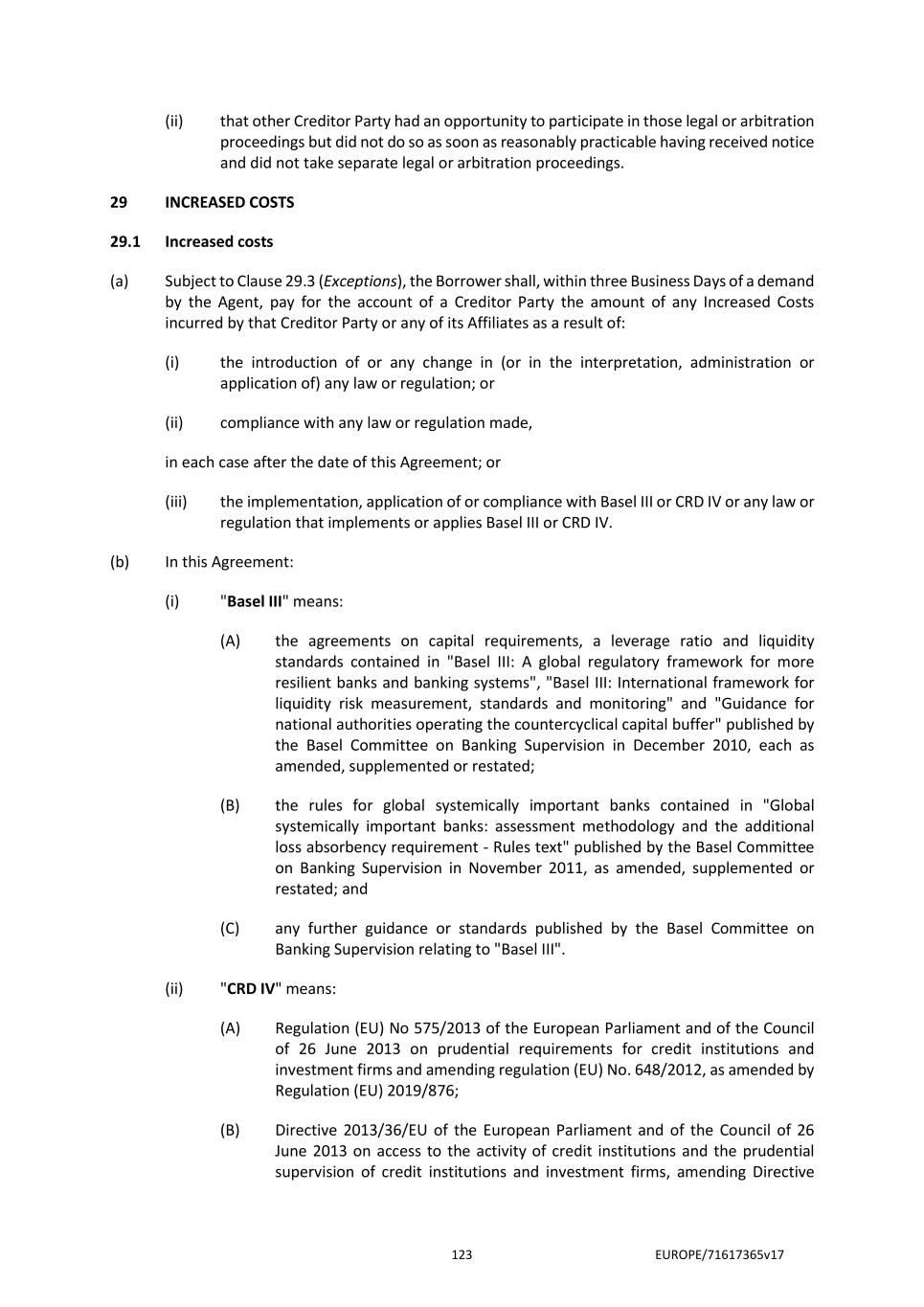 123 EUROPE/71617365v17 (ii) that other Creditor Party had an opportunity to participate in those legal or arbitration proceedings but did not do so as soon as reasonably practicable having received notice and did not take separate legal or arbitration proceedings. 29 INCREASED COSTS 29.1 Increased costs (a) Subject to Clause 29.3 (Exceptions), the Borrower shall, within three Business Days of a demand by the Agent, pay for the account of a Creditor Party the amount of any Increased Costs incurred by that Creditor Party or any of its Affiliates as a result of: (i) the introduction of or any change in (or in the interpretation, administration or application of) any law or regulation; or (ii) compliance with any law or regulation made, in each case after the date of this Agreement; or (iii) the implementation, application of or compliance with Basel III or CRD IV or any law or regulation that implements or applies Basel III or CRD IV. (b) In this Agreement: (i) "Basel III" means: (A) the agreements on capital requirements, a leverage ratio and liquidity standards contained in "Basel III: A global regulatory framework for more resilient banks and banking systems", "Basel III: International framework for liquidity risk measurement, standards and monitoring" and "Guidance for national authorities operating the countercyclical capital buffer" published by the Basel Committee on Banking Supervision in December 2010, each as amended, supplemented or restated; (B) the rules for global systemically important banks contained in "Global systemically important banks: assessment methodology and the additional loss absorbency requirement - Rules text" published by the Basel Committee on Banking Supervision in November 2011, as amended, supplemented or restated; and (C) any further guidance or standards published by the Basel Committee on Banking Supervision relating to "Basel III". (ii) "CRD IV" means: (A) Regulation (EU) No 575/2013 of the European Parliament and of the Council of 26 June 2013 on prudential requirements for credit institutions and investment firms and amending regulation (EU) No. 648/2012, as amended by Regulation (EU) 2019/876; (B) Directive 2013/36/EU of the European Parliament and of the Council of 26 June 2013 on access to the activity of credit institutions and the prudential supervision of credit institutions and investment firms, amending Directive