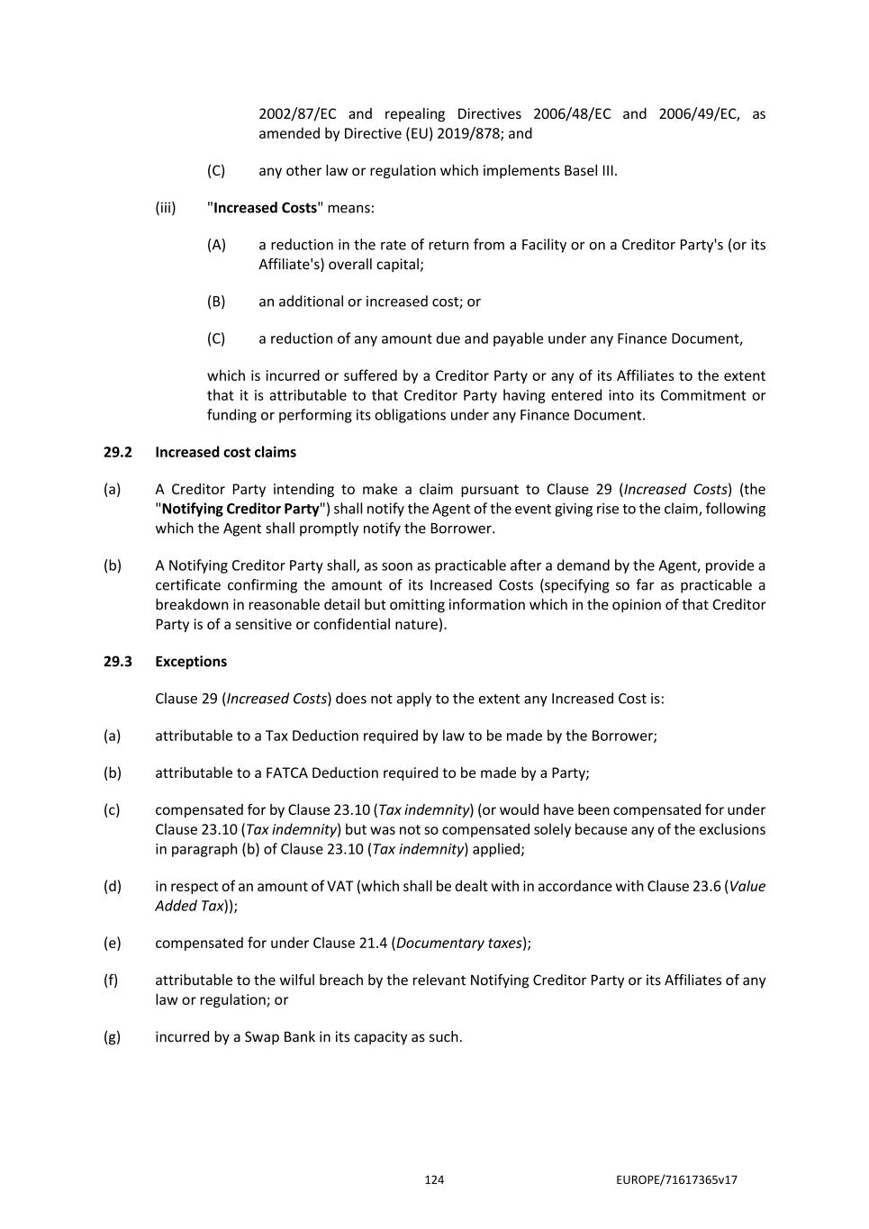 124 EUROPE/71617365v17 2002/87/EC and repealing Directives 2006/48/EC and 2006/49/EC, as amended by Directive (EU) 2019/878; and (C) any other law or regulation which implements Basel III. (iii) "Increased Costs" means: (A) a reduction in the rate of return from a Facility or on a Creditor Party's (or its Affiliate's) overall capital; (B) an additional or increased cost; or (C) a reduction of any amount due and payable under any Finance Document, which is incurred or suffered by a Creditor Party or any of its Affiliates to the extent that it is attributable to that Creditor Party having entered into its Commitment or funding or performing its obligations under any Finance Document. 29.2 Increased cost claims (a) A Creditor Party intending to make a claim pursuant to Clause 29 (Increased Costs) (the "Notifying Creditor Party") shall notify the Agent of the event giving rise to the claim, following which the Agent shall promptly notify the Borrower. (b) A Notifying Creditor Party shall, as soon as practicable after a demand by the Agent, provide a certificate confirming the amount of its Increased Costs (specifying so far as practicable a breakdown in reasonable detail but omitting information which in the opinion of that Creditor Party is of a sensitive or confidential nature). 29.3 Exceptions Clause 29 (Increased Costs) does not apply to the extent any Increased Cost is: (a) attributable to a Tax Deduction required by law to be made by the Borrower; (b) attributable to a FATCA Deduction required to be made by a Party; (c) compensated for by Clause 23.10 (Tax indemnity) (or would have been compensated for under Clause 23.10 (Tax indemnity) but was not so compensated solely because any of the exclusions in paragraph (b) of Clause 23.10 (Tax indemnity) applied; (d) in respect of an amount of VAT (which shall be dealt with in accordance with Clause 23.6 (Value Added Tax)); (e) compensated for under Clause 21.4 (Documentary taxes); (f) attributable to the wilful breach by the relevant Notifying Creditor Party or its Affiliates of any law or regulation; or (g) incurred by a Swap Bank in its capacity as such.