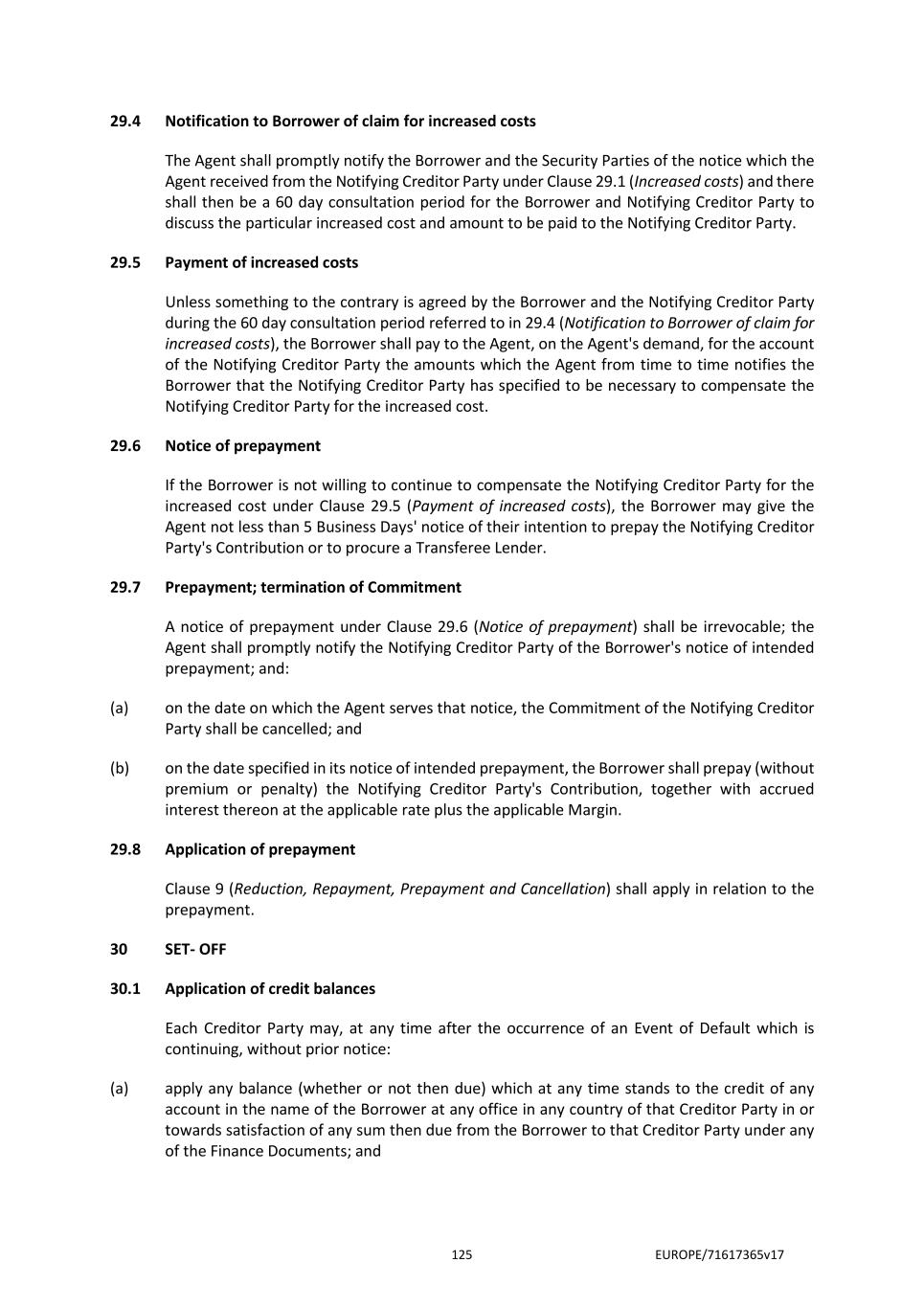 125 EUROPE/71617365v17 29.4 Notification to Borrower of claim for increased costs The Agent shall promptly notify the Borrower and the Security Parties of the notice which the Agent received from the Notifying Creditor Party under Clause 29.1 (Increased costs) and there shall then be a 60 day consultation period for the Borrower and Notifying Creditor Party to discuss the particular increased cost and amount to be paid to the Notifying Creditor Party. 29.5 Payment of increased costs Unless something to the contrary is agreed by the Borrower and the Notifying Creditor Party during the 60 day consultation period referred to in 29.4 (Notification to Borrower of claim for increased costs), the Borrower shall pay to the Agent, on the Agent's demand, for the account of the Notifying Creditor Party the amounts which the Agent from time to time notifies the Borrower that the Notifying Creditor Party has specified to be necessary to compensate the Notifying Creditor Party for the increased cost. 29.6 Notice of prepayment If the Borrower is not willing to continue to compensate the Notifying Creditor Party for the increased cost under Clause 29.5 (Payment of increased costs), the Borrower may give the Agent not less than 5 Business Days' notice of their intention to prepay the Notifying Creditor Party's Contribution or to procure a Transferee Lender. 29.7 Prepayment; termination of Commitment A notice of prepayment under Clause 29.6 (Notice of prepayment) shall be irrevocable; the Agent shall promptly notify the Notifying Creditor Party of the Borrower's notice of intended prepayment; and: (a) on the date on which the Agent serves that notice, the Commitment of the Notifying Creditor Party shall be cancelled; and (b) on the date specified in its notice of intended prepayment, the Borrower shall prepay (without premium or penalty) the Notifying Creditor Party's Contribution, together with accrued interest thereon at the applicable rate plus the applicable Margin. 29.8 Application of prepayment Clause 9 (Reduction, Repayment, Prepayment and Cancellation) shall apply in relation to the prepayment. 30 SET- OFF 30.1 Application of credit balances Each Creditor Party may, at any time after the occurrence of an Event of Default which is continuing, without prior notice: (a) apply any balance (whether or not then due) which at any time stands to the credit of any account in the name of the Borrower at any office in any country of that Creditor Party in or towards satisfaction of any sum then due from the Borrower to that Creditor Party under any of the Finance Documents; and