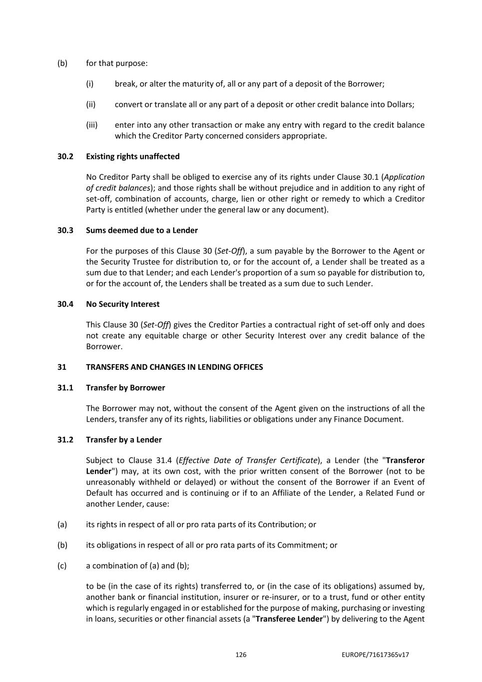 126 EUROPE/71617365v17 (b) for that purpose: (i) break, or alter the maturity of, all or any part of a deposit of the Borrower; (ii) convert or translate all or any part of a deposit or other credit balance into Dollars; (iii) enter into any other transaction or make any entry with regard to the credit balance which the Creditor Party concerned considers appropriate. 30.2 Existing rights unaffected No Creditor Party shall be obliged to exercise any of its rights under Clause 30.1 (Application of credit balances); and those rights shall be without prejudice and in addition to any right of set-off, combination of accounts, charge, lien or other right or remedy to which a Creditor Party is entitled (whether under the general law or any document). 30.3 Sums deemed due to a Lender For the purposes of this Clause 30 (Set-Off), a sum payable by the Borrower to the Agent or the Security Trustee for distribution to, or for the account of, a Lender shall be treated as a sum due to that Lender; and each Lender's proportion of a sum so payable for distribution to, or for the account of, the Lenders shall be treated as a sum due to such Lender. 30.4 No Security Interest This Clause 30 (Set-Off) gives the Creditor Parties a contractual right of set-off only and does not create any equitable charge or other Security Interest over any credit balance of the Borrower. 31 TRANSFERS AND CHANGES IN LENDING OFFICES 31.1 Transfer by Borrower The Borrower may not, without the consent of the Agent given on the instructions of all the Lenders, transfer any of its rights, liabilities or obligations under any Finance Document. 31.2 Transfer by a Lender Subject to Clause 31.4 (Effective Date of Transfer Certificate), a Lender (the "Transferor Lender") may, at its own cost, with the prior written consent of the Borrower (not to be unreasonably withheld or delayed) or without the consent of the Borrower if an Event of Default has occurred and is continuing or if to an Affiliate of the Lender, a Related Fund or another Lender, cause: (a) its rights in respect of all or pro rata parts of its Contribution; or (b) its obligations in respect of all or pro rata parts of its Commitment; or (c) a combination of (a) and (b); to be (in the case of its rights) transferred to, or (in the case of its obligations) assumed by, another bank or financial institution, insurer or re-insurer, or to a trust, fund or other entity which is regularly engaged in or established for the purpose of making, purchasing or investing in loans, securities or other financial assets (a "Transferee Lender") by delivering to the Agent
