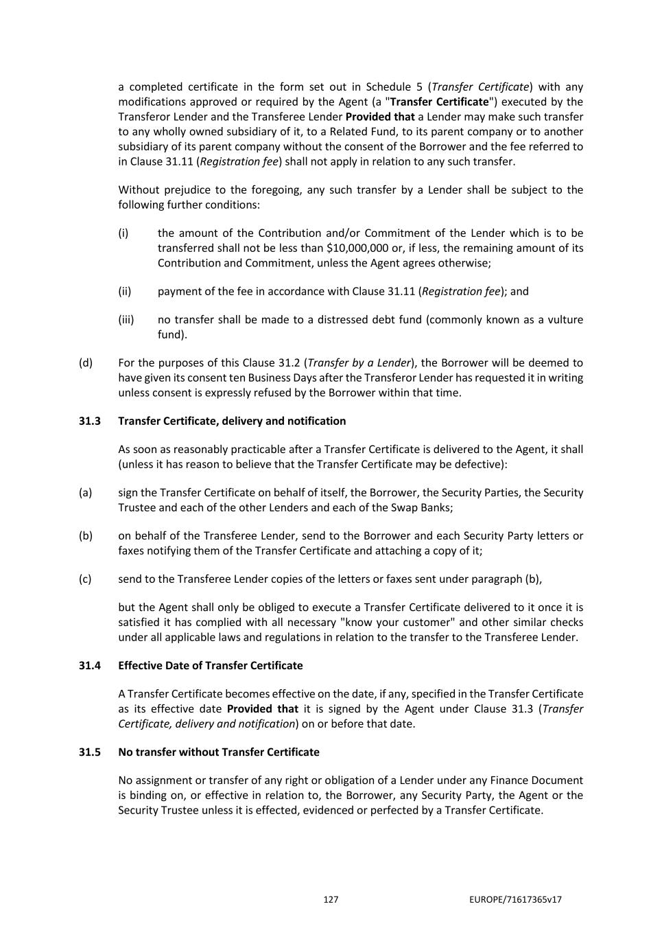 127 EUROPE/71617365v17 a completed certificate in the form set out in Schedule 5 (Transfer Certificate) with any modifications approved or required by the Agent (a "Transfer Certificate") executed by the Transferor Lender and the Transferee Lender Provided that a Lender may make such transfer to any wholly owned subsidiary of it, to a Related Fund, to its parent company or to another subsidiary of its parent company without the consent of the Borrower and the fee referred to in Clause 31.11 (Registration fee) shall not apply in relation to any such transfer. Without prejudice to the foregoing, any such transfer by a Lender shall be subject to the following further conditions: (i) the amount of the Contribution and/or Commitment of the Lender which is to be transferred shall not be less than $10,000,000 or, if less, the remaining amount of its Contribution and Commitment, unless the Agent agrees otherwise; (ii) payment of the fee in accordance with Clause 31.11 (Registration fee); and (iii) no transfer shall be made to a distressed debt fund (commonly known as a vulture fund). (d) For the purposes of this Clause 31.2 (Transfer by a Lender), the Borrower will be deemed to have given its consent ten Business Days after the Transferor Lender has requested it in writing unless consent is expressly refused by the Borrower within that time. 31.3 Transfer Certificate, delivery and notification As soon as reasonably practicable after a Transfer Certificate is delivered to the Agent, it shall (unless it has reason to believe that the Transfer Certificate may be defective): (a) sign the Transfer Certificate on behalf of itself, the Borrower, the Security Parties, the Security Trustee and each of the other Lenders and each of the Swap Banks; (b) on behalf of the Transferee Lender, send to the Borrower and each Security Party letters or faxes notifying them of the Transfer Certificate and attaching a copy of it; (c) send to the Transferee Lender copies of the letters or faxes sent under paragraph (b), but the Agent shall only be obliged to execute a Transfer Certificate delivered to it once it is satisfied it has complied with all necessary "know your customer" and other similar checks under all applicable laws and regulations in relation to the transfer to the Transferee Lender. 31.4 Effective Date of Transfer Certificate A Transfer Certificate becomes effective on the date, if any, specified in the Transfer Certificate as its effective date Provided that it is signed by the Agent under Clause 31.3 (Transfer Certificate, delivery and notification) on or before that date. 31.5 No transfer without Transfer Certificate No assignment or transfer of any right or obligation of a Lender under any Finance Document is binding on, or effective in relation to, the Borrower, any Security Party, the Agent or the Security Trustee unless it is effected, evidenced or perfected by a Transfer Certificate.