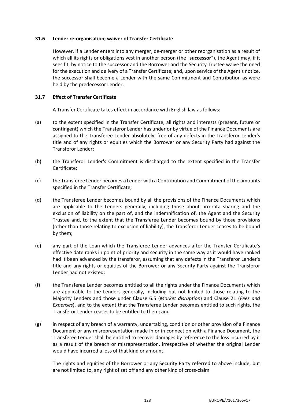 128 EUROPE/71617365v17 31.6 Lender re-organisation; waiver of Transfer Certificate However, if a Lender enters into any merger, de-merger or other reorganisation as a result of which all its rights or obligations vest in another person (the "successor"), the Agent may, if it sees fit, by notice to the successor and the Borrower and the Security Trustee waive the need for the execution and delivery of a Transfer Certificate; and, upon service of the Agent's notice, the successor shall become a Lender with the same Commitment and Contribution as were held by the predecessor Lender. 31.7 Effect of Transfer Certificate A Transfer Certificate takes effect in accordance with English law as follows: (a) to the extent specified in the Transfer Certificate, all rights and interests (present, future or contingent) which the Transferor Lender has under or by virtue of the Finance Documents are assigned to the Transferee Lender absolutely, free of any defects in the Transferor Lender's title and of any rights or equities which the Borrower or any Security Party had against the Transferor Lender; (b) the Transferor Lender's Commitment is discharged to the extent specified in the Transfer Certificate; (c) the Transferee Lender becomes a Lender with a Contribution and Commitment of the amounts specified in the Transfer Certificate; (d) the Transferee Lender becomes bound by all the provisions of the Finance Documents which are applicable to the Lenders generally, including those about pro-rata sharing and the exclusion of liability on the part of, and the indemnification of, the Agent and the Security Trustee and, to the extent that the Transferee Lender becomes bound by those provisions (other than those relating to exclusion of liability), the Transferor Lender ceases to be bound by them; (e) any part of the Loan which the Transferee Lender advances after the Transfer Certificate's effective date ranks in point of priority and security in the same way as it would have ranked had it been advanced by the transferor, assuming that any defects in the Transferor Lender's title and any rights or equities of the Borrower or any Security Party against the Transferor Lender had not existed; (f) the Transferee Lender becomes entitled to all the rights under the Finance Documents which are applicable to the Lenders generally, including but not limited to those relating to the Majority Lenders and those under Clause 6.5 (Market disruption) and Clause 21 (Fees and Expenses), and to the extent that the Transferee Lender becomes entitled to such rights, the Transferor Lender ceases to be entitled to them; and (g) in respect of any breach of a warranty, undertaking, condition or other provision of a Finance Document or any misrepresentation made in or in connection with a Finance Document, the Transferee Lender shall be entitled to recover damages by reference to the loss incurred by it as a result of the breach or misrepresentation, irrespective of whether the original Lender would have incurred a loss of that kind or amount. The rights and equities of the Borrower or any Security Party referred to above include, but are not limited to, any right of set off and any other kind of cross-claim.