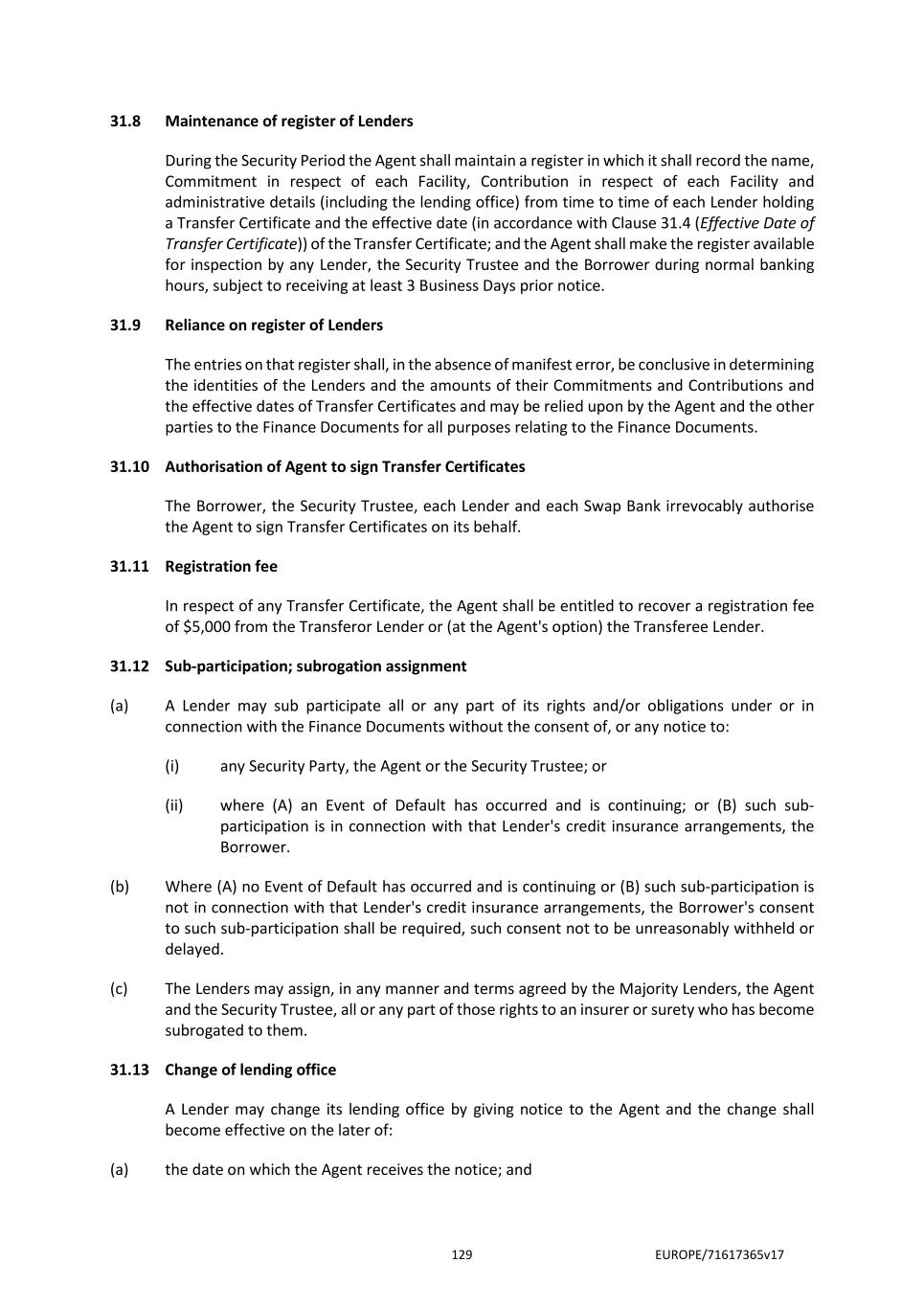 129 EUROPE/71617365v17 31.8 Maintenance of register of Lenders During the Security Period the Agent shall maintain a register in which it shall record the name, Commitment in respect of each Facility, Contribution in respect of each Facility and administrative details (including the lending office) from time to time of each Lender holding a Transfer Certificate and the effective date (in accordance with Clause 31.4 (Effective Date of Transfer Certificate)) of the Transfer Certificate; and the Agent shall make the register available for inspection by any Lender, the Security Trustee and the Borrower during normal banking hours, subject to receiving at least 3 Business Days prior notice. 31.9 Reliance on register of Lenders The entries on that register shall, in the absence of manifest error, be conclusive in determining the identities of the Lenders and the amounts of their Commitments and Contributions and the effective dates of Transfer Certificates and may be relied upon by the Agent and the other parties to the Finance Documents for all purposes relating to the Finance Documents. 31.10 Authorisation of Agent to sign Transfer Certificates The Borrower, the Security Trustee, each Lender and each Swap Bank irrevocably authorise the Agent to sign Transfer Certificates on its behalf. 31.11 Registration fee In respect of any Transfer Certificate, the Agent shall be entitled to recover a registration fee of $5,000 from the Transferor Lender or (at the Agent's option) the Transferee Lender. 31.12 Sub-participation; subrogation assignment (a) A Lender may sub participate all or any part of its rights and/or obligations under or in connection with the Finance Documents without the consent of, or any notice to: (i) any Security Party, the Agent or the Security Trustee; or (ii) where (A) an Event of Default has occurred and is continuing; or (B) such sub- participation is in connection with that Lender's credit insurance arrangements, the Borrower. (b) Where (A) no Event of Default has occurred and is continuing or (B) such sub-participation is not in connection with that Lender's credit insurance arrangements, the Borrower's consent to such sub-participation shall be required, such consent not to be unreasonably withheld or delayed. (c) The Lenders may assign, in any manner and terms agreed by the Majority Lenders, the Agent and the Security Trustee, all or any part of those rights to an insurer or surety who has become subrogated to them. 31.13 Change of lending office A Lender may change its lending office by giving notice to the Agent and the change shall become effective on the later of: (a) the date on which the Agent receives the notice; and